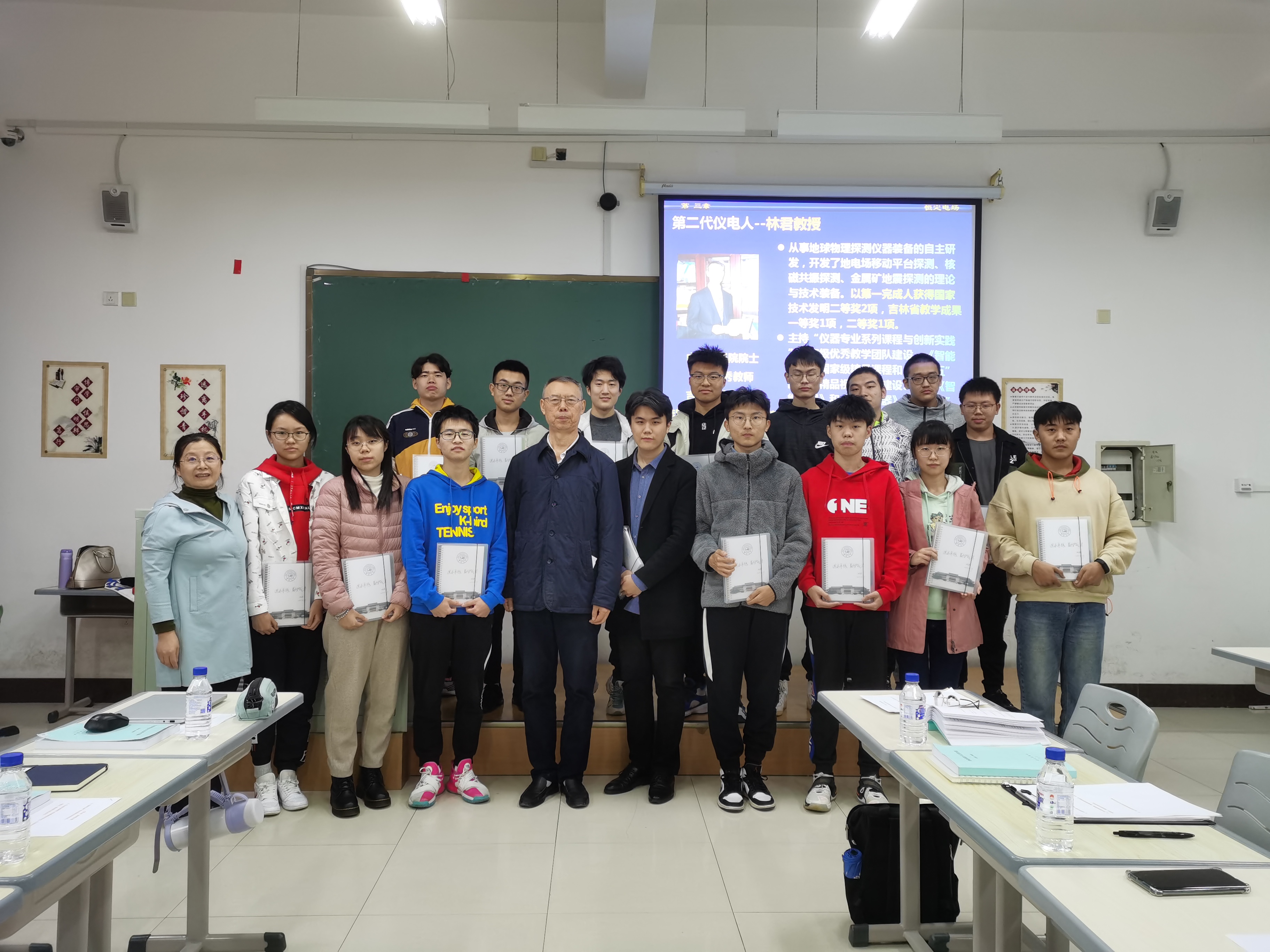 课程开始,嵇艳鞠老师介绍本次交流的主要内容,依托专业课程搭建院士与本科生的交流平台,鼓励同学们把握机会,积极交流。林君院士与同学们分享了自己的成长经历,从少年时期的勤学苦读到留校任教后四十三年如一日的默默坚守,再到“把论文写在祖国大地上”的杰出科研工作者,他强调坚持信念、不懈努力的重要性,鼓励同学们珍惜时光,不负韶华,提升自己,贡献青年力量。听完林君院士的讲述,在座同学深受触动,利用宝贵的机会积极沟通交流,围绕科学研究的实际应用、未来人生发展规划提出自己的问题,林君老师一一进行耐心解答,课堂氛围热烈,同学们的科研兴趣得到了进一步提升。当问及是什么理想信念支撑林君老师坚持四十三年从事地学仪器研发时,一句“简单来说就是责任”的回答充满重量。最后林君老师再次鼓励同学们要有所追求、勇于担当,把个人理想融入到祖国的发展事业中,做具有家国情怀的新时代奋斗者。会后,林君院士还亲切地赠与参会同学笔记本作为鼓励,激励同学们“追求卓越,勤学成才”。