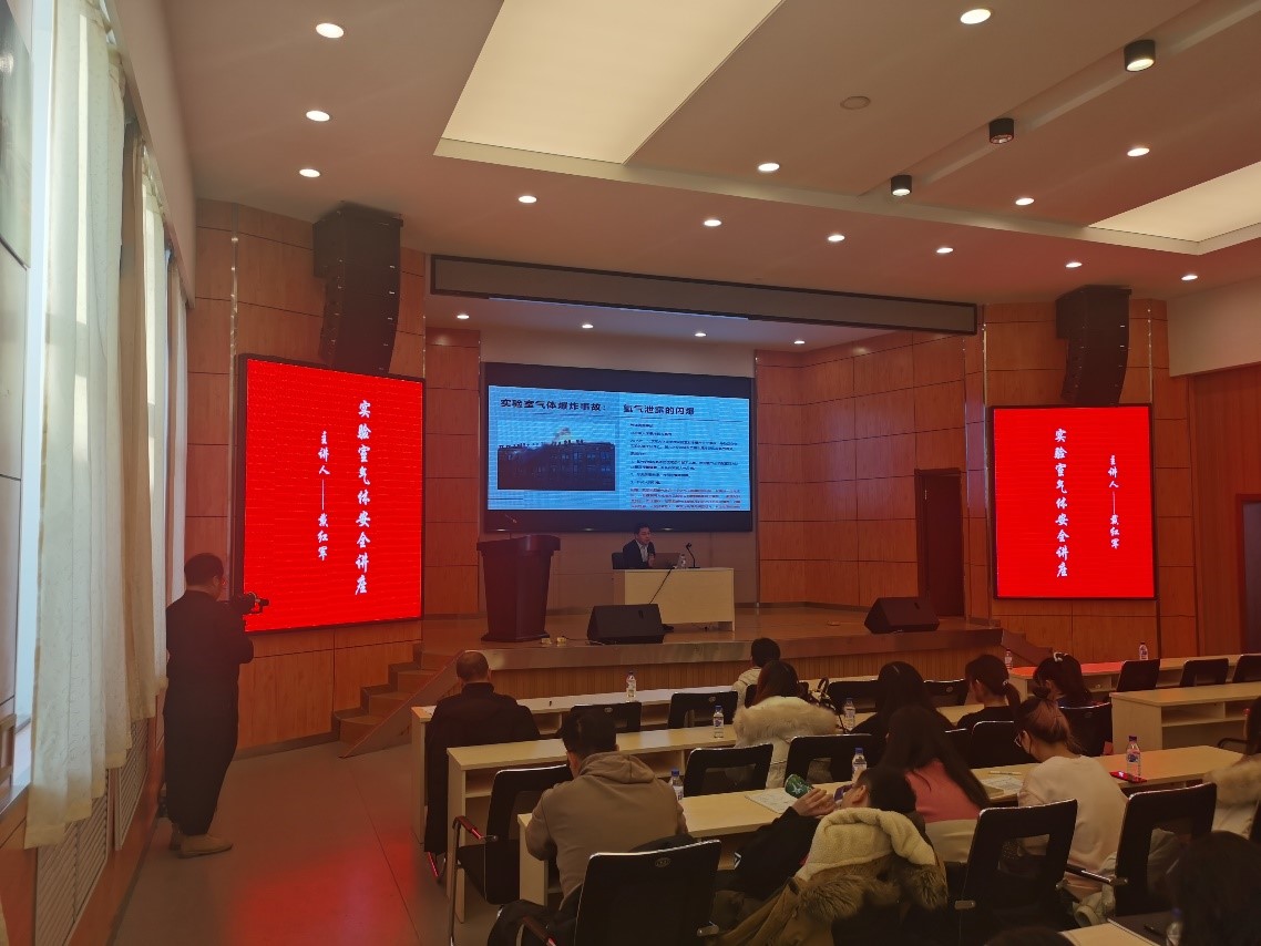 副院长张贺主讲,张贺结合多起由危险化学品引发事故的典型案例,深入分析了实验室用电、用火、危险化学试剂管理等方面可能存在的潜在危险,为参会师生树立了预防为主、未雨绸缪的指导思想。讲座第二部分由广州德标智能化工程有限公司的戴红军主讲,戴红军以《实验室气体安全讲座》为题,重点介绍了有毒气体、易燃易爆气体、惰性气体等可能造成的危害,并对高校实验室气体钢瓶的常见隐患进行了分析。讲座第三部分由长春奥狮环境监测有限公司的刘宇臣主讲,讲座内容包括电离辐射的类型、电离辐射的危害、电离辐射的防护等方面知识。