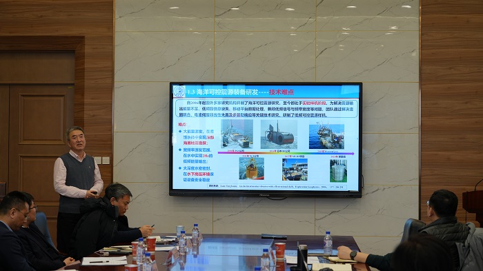 相关科研团队负责人介绍了海洋可控震源装备研发、电磁探测技术、震电联合勘探技术以及海洋重磁测量技术研发现状、数据处理分析技术、应用场景、未来发展趋势及合作研究方向。