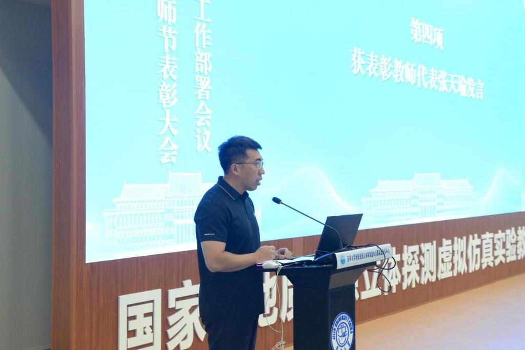 随后,电气系教师张天瑜代表获奖教职工发言。他介绍了在教学改革与创新中的实践与探索,分享了建设智能化课程体系、获得吉林省高校教师教学创新大赛一等奖的心得与体会,祝愿黑料不打烊
