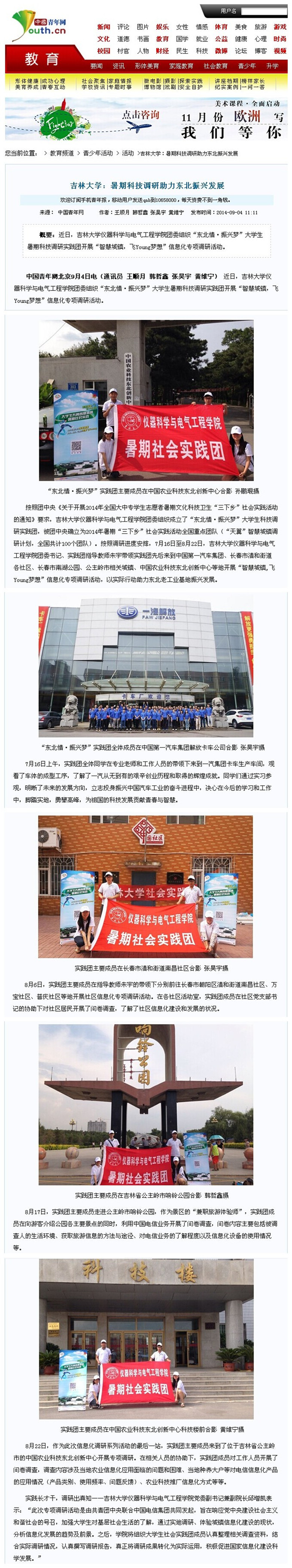 团委书记、实践团指导教师朱宇带领实践团先后来到中国第一汽车集团、长春市清和街道各社区、长春市南湖公园、公主岭市相关城镇、中国农业科技东北创新中心等地开展“智慧城镇,飞Young梦想”信息化专项调研活动,以实际行动助力东北老工业基地振兴发展。此系列活动于2014年9月4日受到共青团中央主办的中央重点新闻网站——中国青年网详细报道,中国青年网以《黑料不打烊