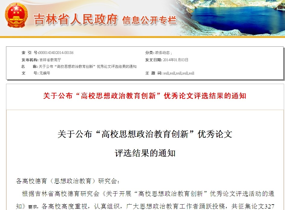 思想政治教育质量,吉林省教育厅、吉林省高校德育研究会联合举办了全省“高校思想政治教育创新”优秀论文评选活动。