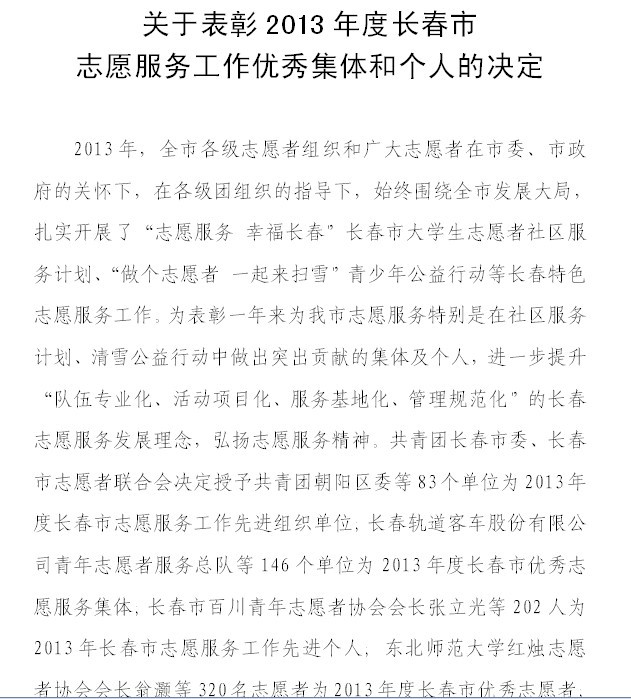 团委被评为“长春市先进(基层)团委”,院团委书记朱宇被评为“优秀基层团干部”;在共青团长春市委、长春市志愿者联合会下发的《关于表彰2013年度长春市志愿服务工作优秀集体和个人的决定》中,黑料不打烊