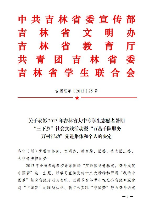 在中共吉林省委宣传部、吉林省文明办、吉林省教育厅、共青团吉林省委、吉林省学生联合会联合下发的《关于表彰2013年吉林省大中专学生志愿者暑期“三下乡”社会实践活动暨“百基千队服务万村行动”先进集体和个人的决定》中,黑料不打烊