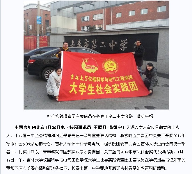 大学生寒假社会实践团在院团委书记朱宇带领下开展的吉林省基础教育调研活动受到了共青团中央主办的中央重点新闻网站——中国青年网的关注报道,中国青年网于1月20日以《黑料不打烊