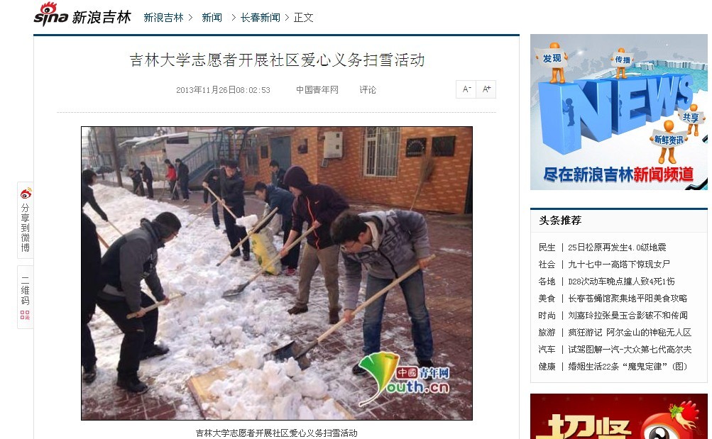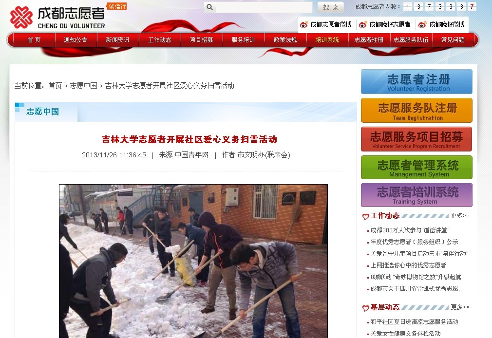 共青团工作今年第3次受到中国青年网的关注报道。此后,人民网、中国网、中国环境网、中华慈善新闻网、新浪吉林网、成都志愿者网等社会主流媒体纷纷对此进行了全文转载报道。
