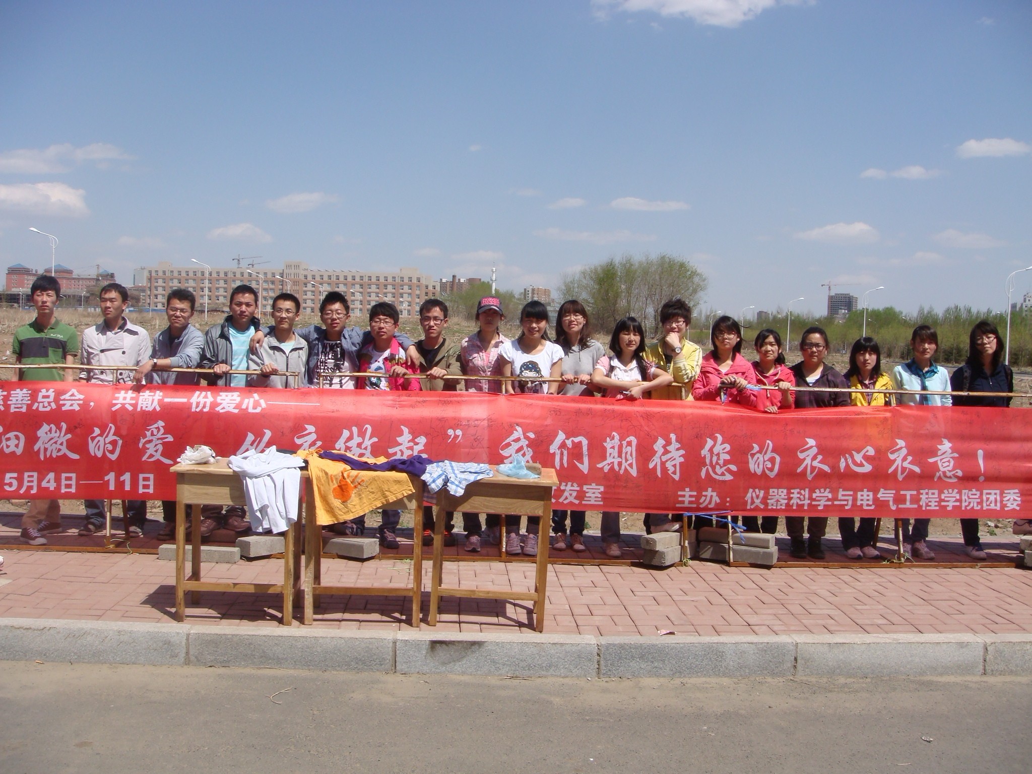 团委携手吉林省慈善总会于2012年5月4日在中心校区李四光教学楼前正式启动了“细微的爱,从衣做起”——爱心衣物捐赠活动。