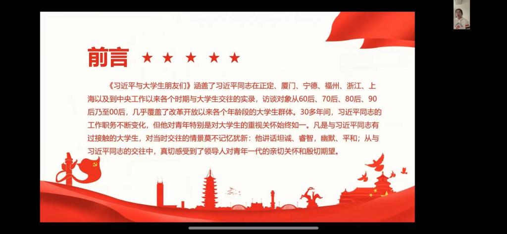 651907班于线上开展了关于《习近平与大学生朋友们》学习分享的系列团日活动,班导师周逢道老师及651907班全体同学参加了此次交流分享会,欧馨雅同学担任此次分享会的主持人。