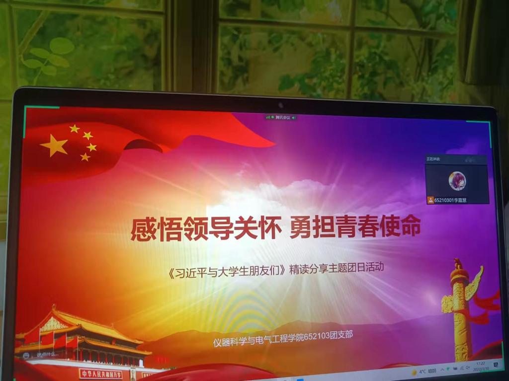 2021级3班团支部举办了以诵读分享书籍《习近平与大学生朋友们》为基本内容、以“牢记领袖教导,分享青春感悟”为主题的团日活动。本次活动采取线上的活动形式开展,团支部书记李嘉慧同学主持分享会,最终成果将提交至《习近平与大学生朋友们》精读大赛。
