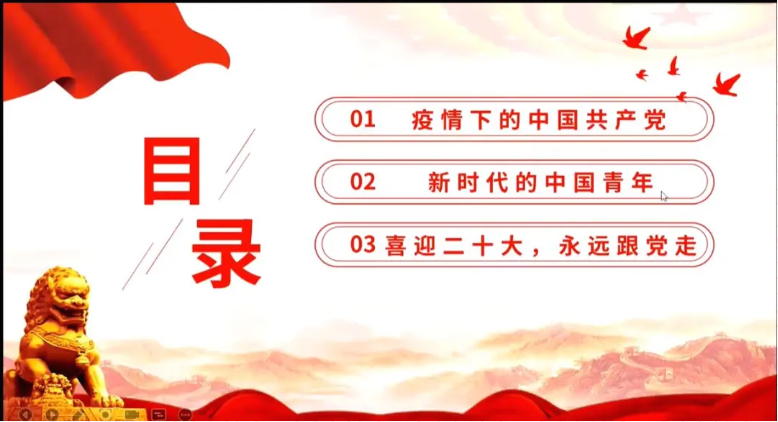 的付出和关怀,大家齐心协力,共克时艰,一定会战胜疫情。最后,高思琦向大家讲述党和国家对青年的殷切期待和新时代中国青年的使命担当,她强调,党的二十大是国家政治生活中的一件大事,鼓励全体同学要以实际行动迎接党的二十大胜利召开。