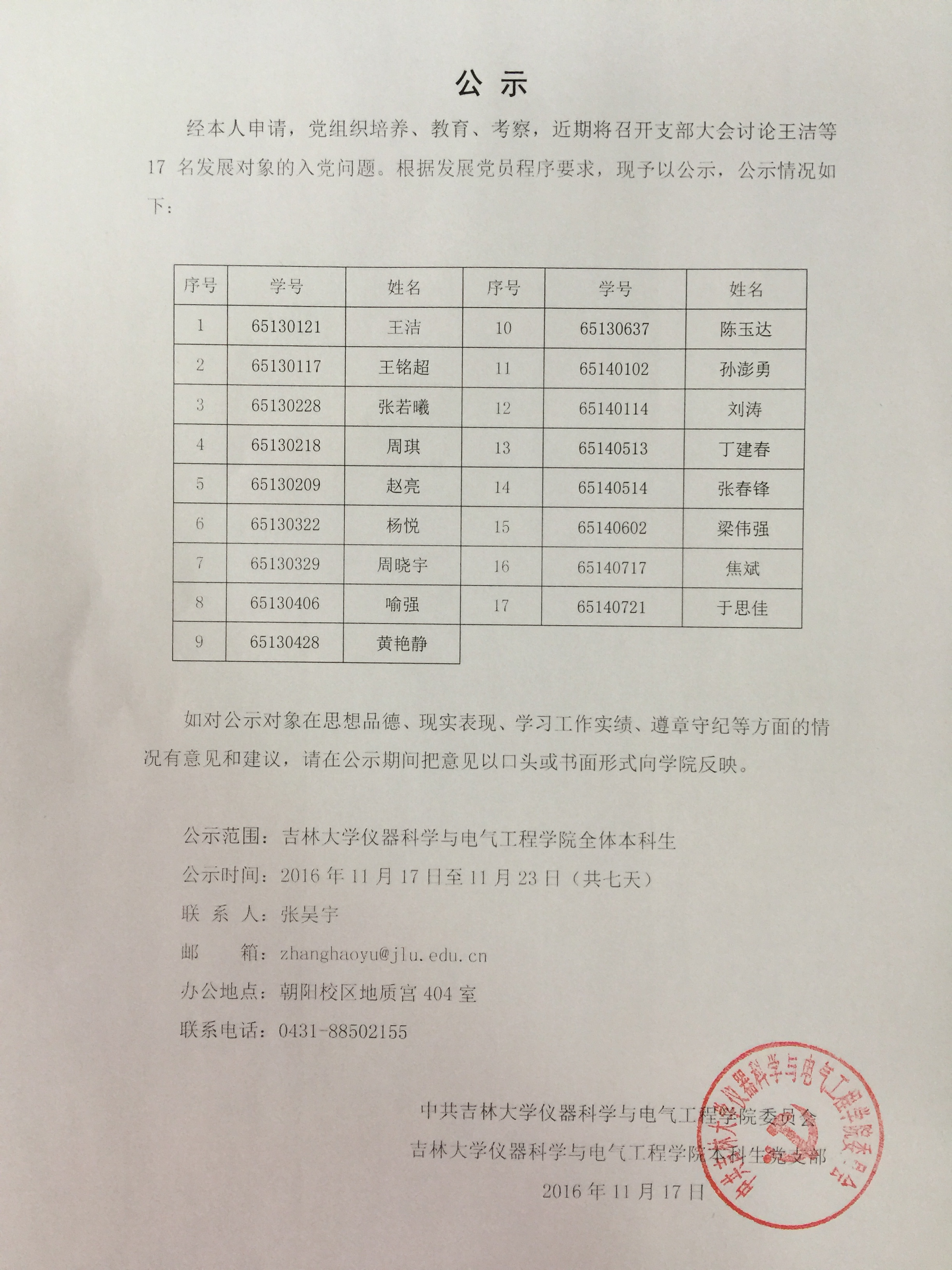 经本人申请,党组织培养、教育、考察,近期将召开支部大会讨论王洁等17名发展对象的入党问题。根据发展党员程序要求,现予以公示,公示情况如下: