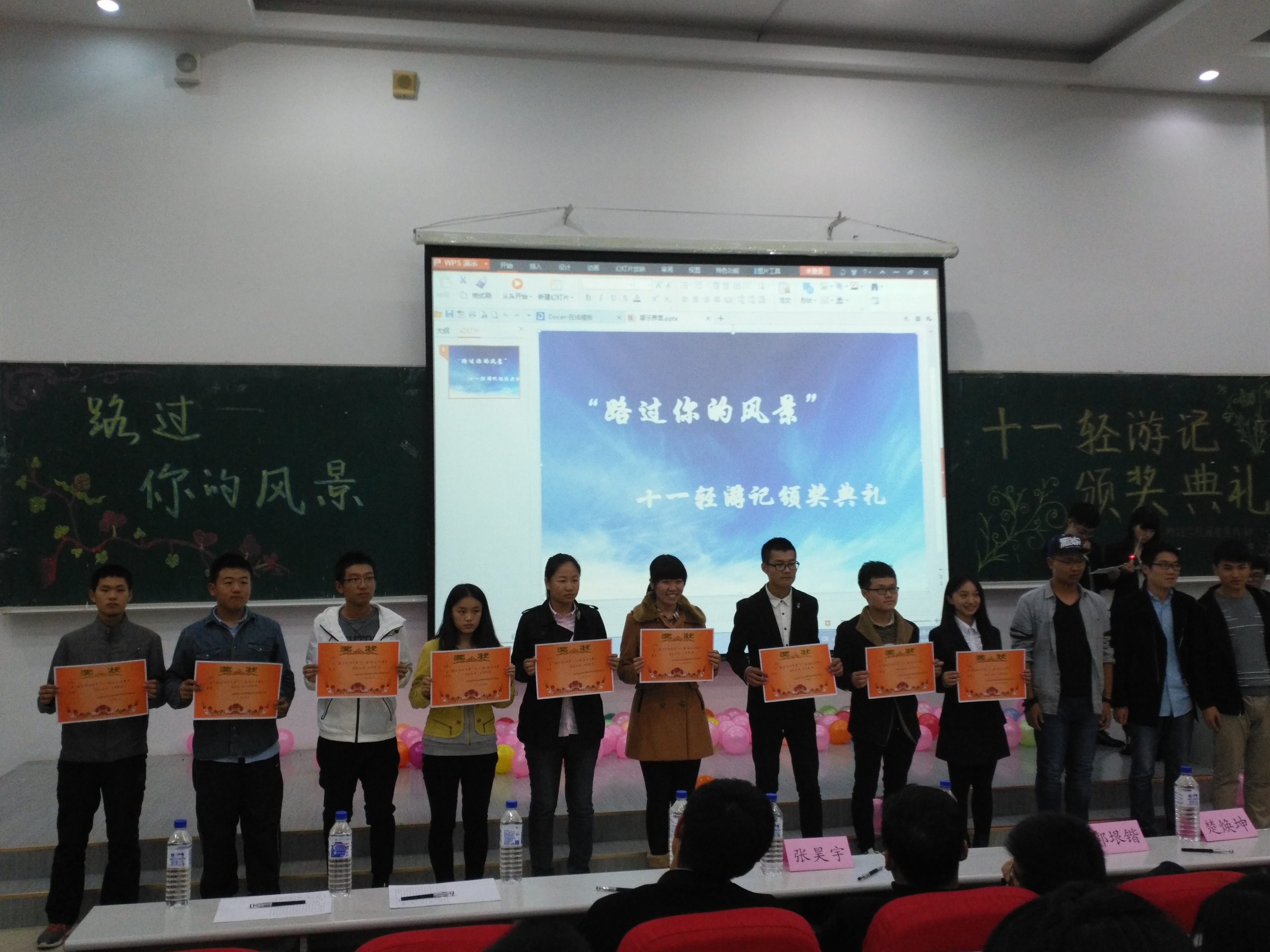 老师到达现场参与评选。活动期间,十五位参赛选手对各自的作品进行了生动形象的描述,描绘了各式各样的或优美或壮丽的富有特色的风景,讲述了拍摄的时间、情景以及自己在十一旅游期间的感受,让在场听众仿佛身临其境,沉浸在照片中风景的世界里。随后,主持人对活动的赞助方日新楼美奈映像证件照专门店进行了简单的介绍。