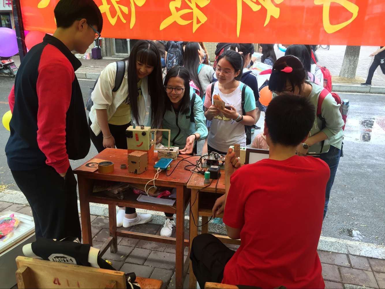 师生和市民朋友,大家都好奇地向科协的同学们提出自己的问题。科协成员一一为大家展示每个作品的功能,耐心地回答大家提出的问题。本次活动还准备了互动环节,各位游客既可以选择列举自己所了解的电子设计领域中常见的10种基本元器件名称,也可以来用DIY电子琴演奏一首自己熟悉的曲目等等。在科协的同学们的提示和帮助下,同学们都在收获新知识的快乐中完成了任务,并都满意地给电子科技协会点了大大的赞。