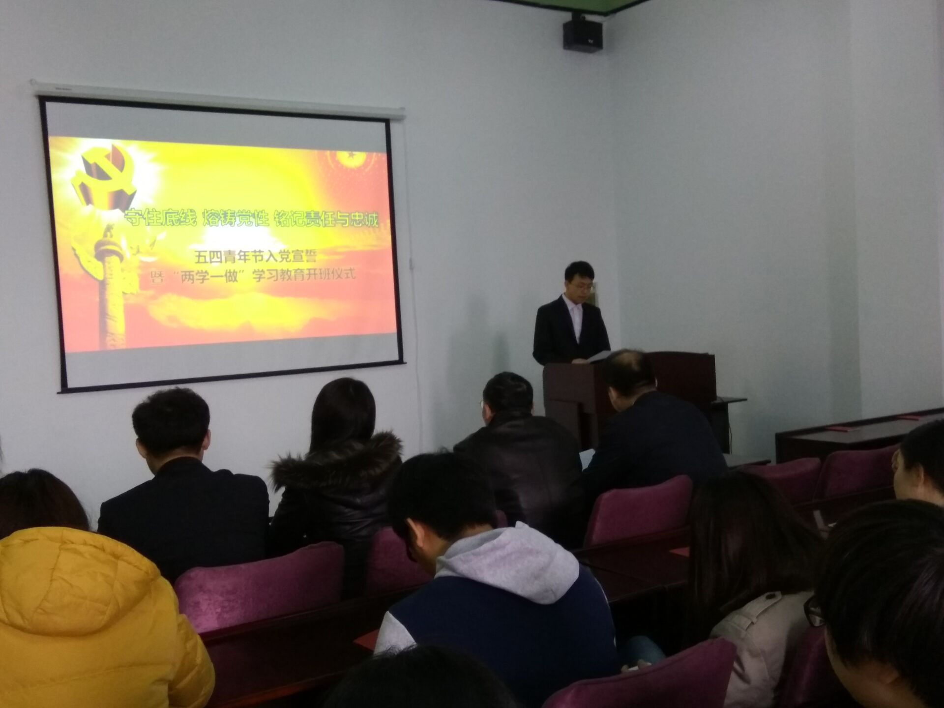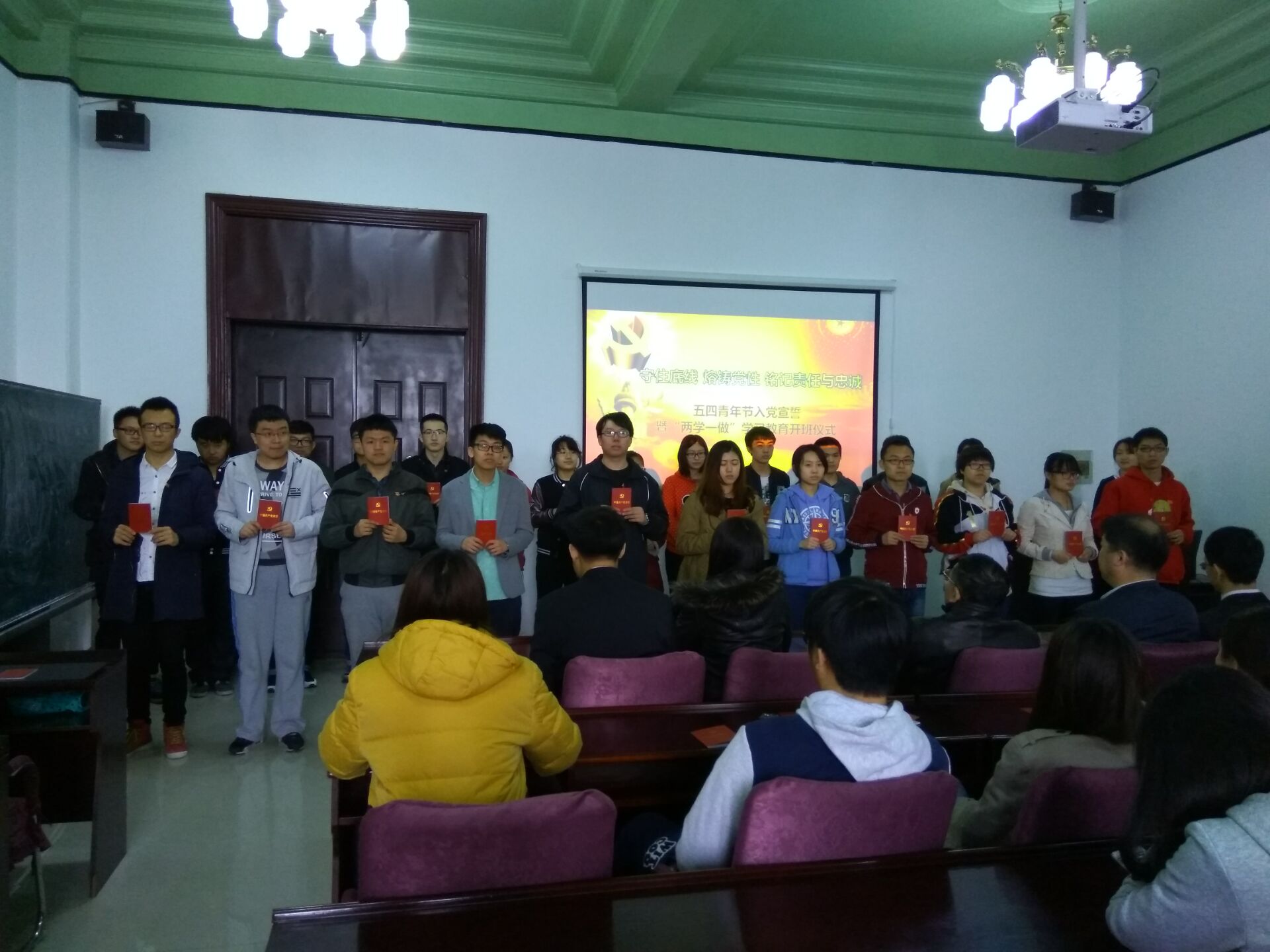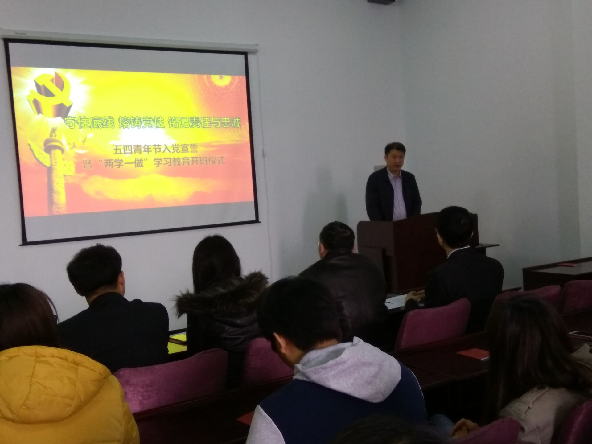 为弘扬五四爱国精神,坚定广大学生党员的理想信念,部署“两学一做”相关工作,黑料不打烊 本科生党支部于2016年5月4日12:30在朝阳校区地质宫208室举行了五四青年入党宣誓暨“两学一做”学习教育开班仪式,黑料不打烊 党委书记余国友教授、党委副书记兼副院长邱增凯老师、学生工作办公室主任王冕老师、本科生党支部全体党员和入党积极分子参加了本次会议。