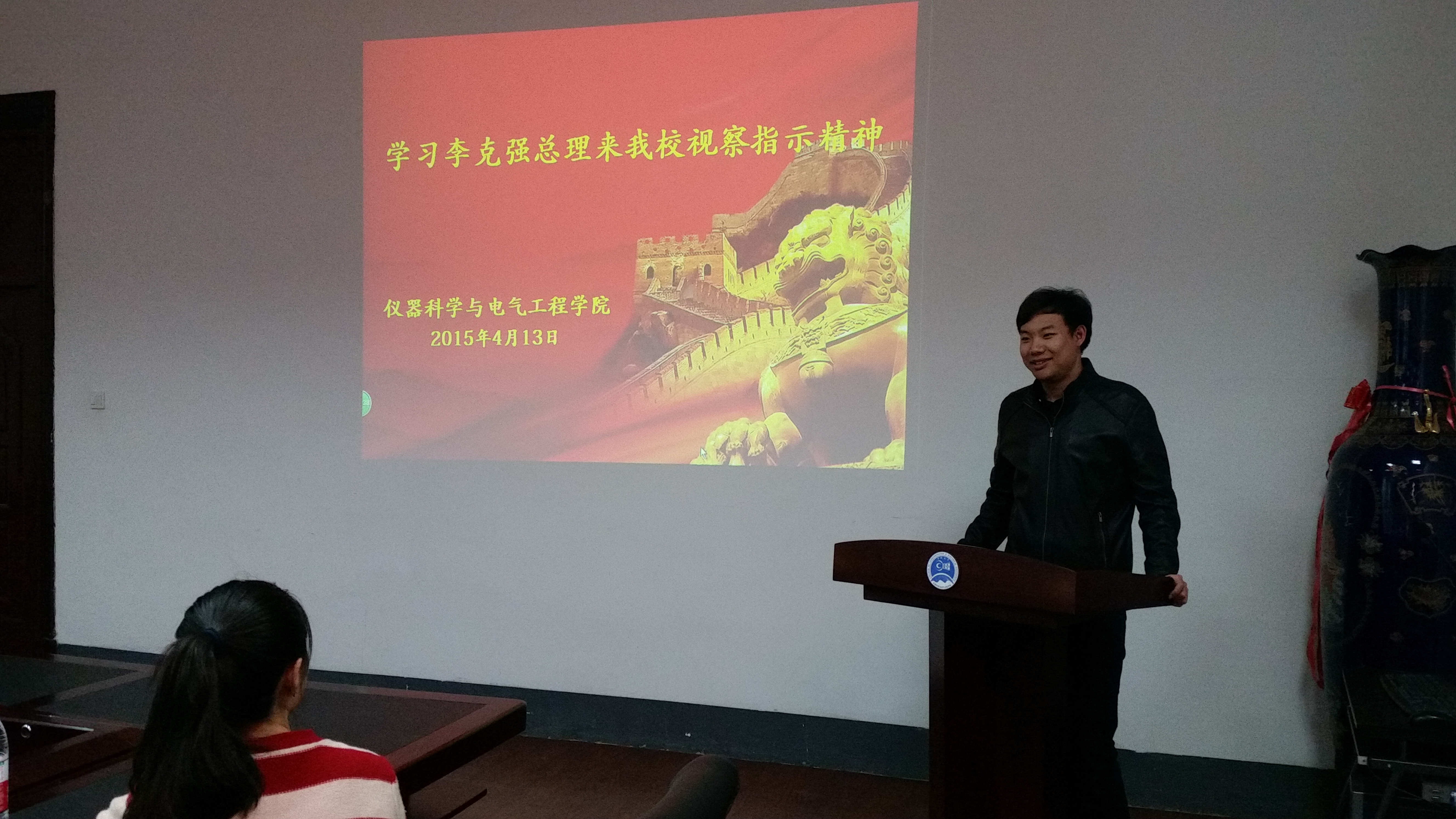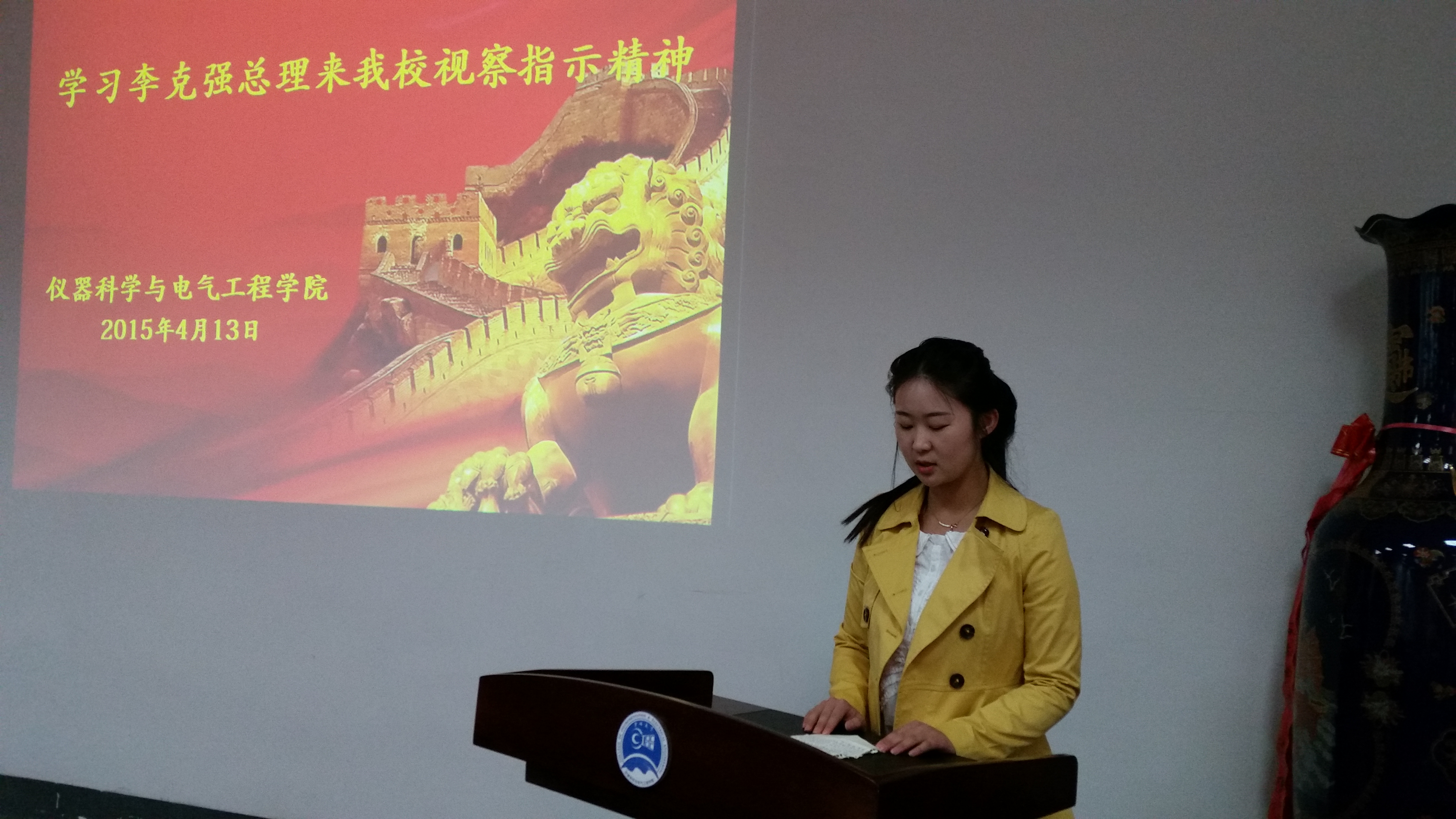 视察指示精神进行了传达。之后,有幸与总理近距离接触,亲身感受总理个人风采的2011级651103班史可同学向大家分享了她与总理接触时的场景与心得体会,通过史可同学的讲述,大家感受到了李克强总理的体贴与平易近人,体会到了总理对大学生就业创业的关心,领会到了总理与广大人民深深的鱼水情。