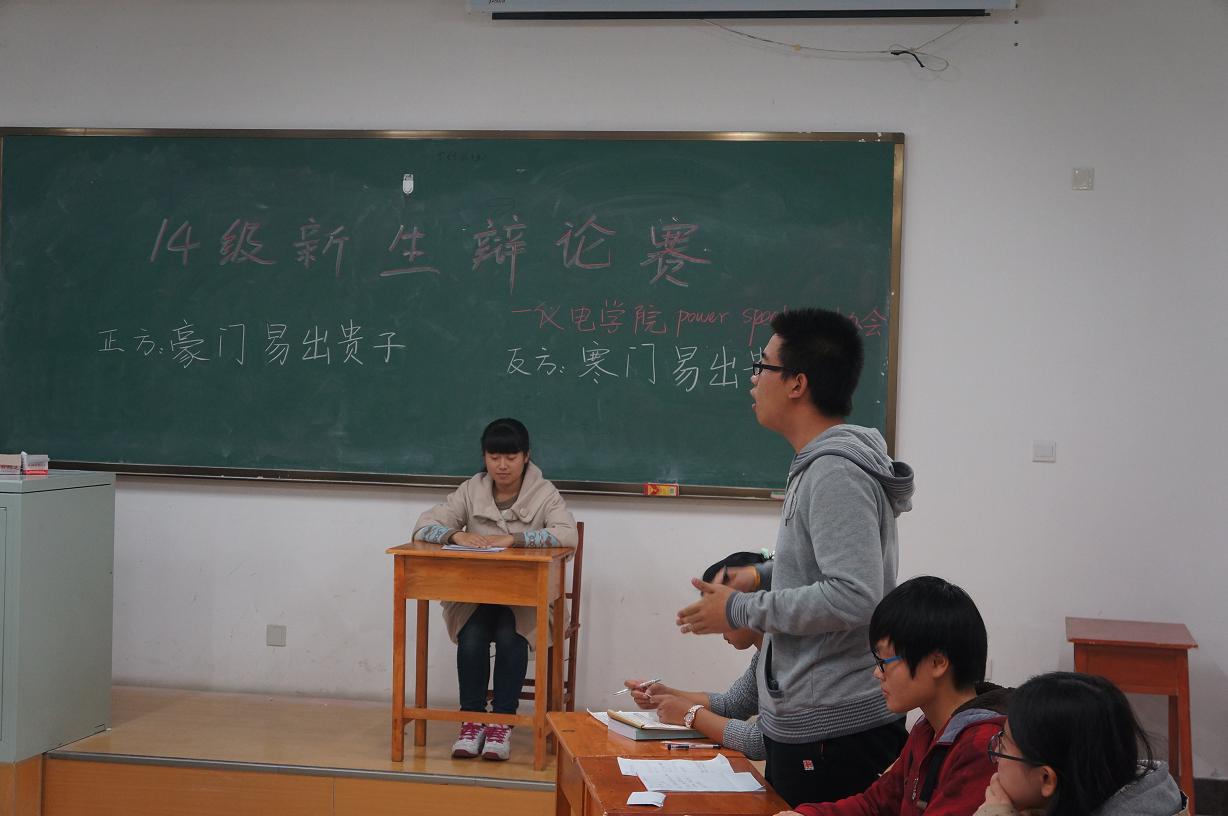学生会举办的“先锋论坛训练赛”于2014年11月3日晚在李四光楼318教室举行。本场比赛由“Power Speaking”协会成员及历届辩论赛的精英辩手担任评委及主持人,辩题分别为“豪门易出贵子VS寒门易出贵子”和“no zuo no die VS no zuo no live”。