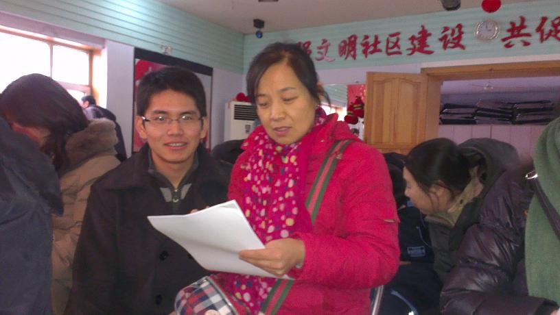 2014年寒假社会实践调查团主要成员于1月17日下午在院团委书记朱宇的带领下分别前往朝阳区清和街道南昌社区、万宝社区、普庆社区等地开展专题调研活动。在各社区活动室,实践团成员在社区党支部书记的协助下分别对初中毕业班学生、初中毕业班学生家长和社区居民开展了问卷调查。实践团成员热情耐心地向被调查人员说明调查目的,协助他们认真完成调查问卷相关内容。经过三个多小时的辛勤工作,社会实践调查团圆满完成了调研任务。