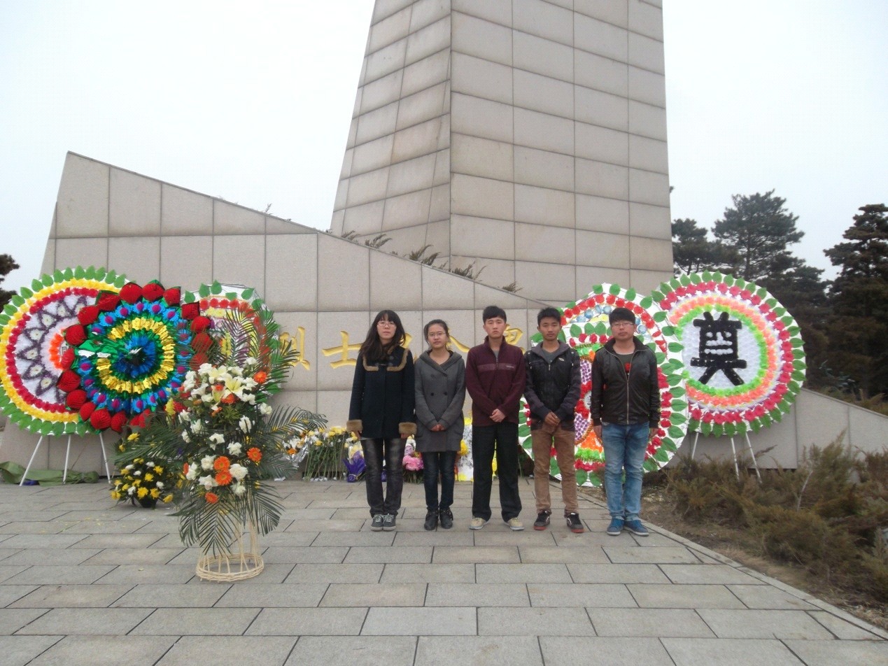 院旗来到长春市九龙源烈士公园。首先,学生代表们向革命英雄敬献承载了崇敬之意的花圈,接着全体同学为烈士默哀三分钟,以表达对先烈的无限哀悼之情。之后,学生代表姜鹏致献悼念词,悲伤及崇敬的声音在纪念碑前久久的回荡,哀痛的言词表达了对英灵已逝的无限伤怀。随后,同学们参观了抗美援朝纪念馆,对烈士的事迹进行了学习和了解。那泛黄的书信、生锈的武器、悲惨的照片无不栩栩如生地显示出当年战争的残酷和革命先烈们为解放而做出的重大牺牲,“誓死不做亡国奴”的铮铮誓言在今天仍激励着中国人民奋勇向前。走出纪念馆,同学们瞻仰了公安英烈广场,向英烈公墓敬礼。最后,全体同学在革命烈士纪念碑前合影,纪念活动顺利结束。