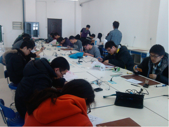 2013年3月8日15:00时,为期6天的培训活动正式开始。活动中,首先由科协副部为学员们发放了相关电子器件,学员们表现出了极大的好奇心,迫不及待地想要亲手进行焊接工作。科协副部张兴宇同学给学员们介绍了器件的名称、用途。接下来,他展示了自己焊接的成品,结合电路图详细地讲解了焊接方法和原理,并且强调了焊接注意事项和安全问题。随后,科协副部黄维宁同学亲手为学员们演示了焊接过程,学员们积极认真地观看学习。此后学员们已经按捺不住跃跃欲试,纷纷投入到焊接工作中。经过了上学期科协的培训,学员们已经基本掌握了焊接方法,所以本次培训学员们快速地进入了状态。科协副部黄婉玉,刘锡洋同学深入到学员们中去,为学员们答疑解难,纠正错误,一对一进行指导。培训活动有条不紊地进行着。很快,有不少同学就已经做出了成品,科协副部李京杰同学为学员们的成品进行检查和测试,由副部张楠同学对焊接速度较快同学的信息进行了整理,并对同学们的作品做出了评价与记录。在副部们的帮助下,每位学员都完成了自己的焊接工作。学员们拿着自己亲手焊接的作品,脸上充满了喜悦与自豪。3月15日17:00时,培训在一片和谐热烈的气氛中圆满落下了帷幕。