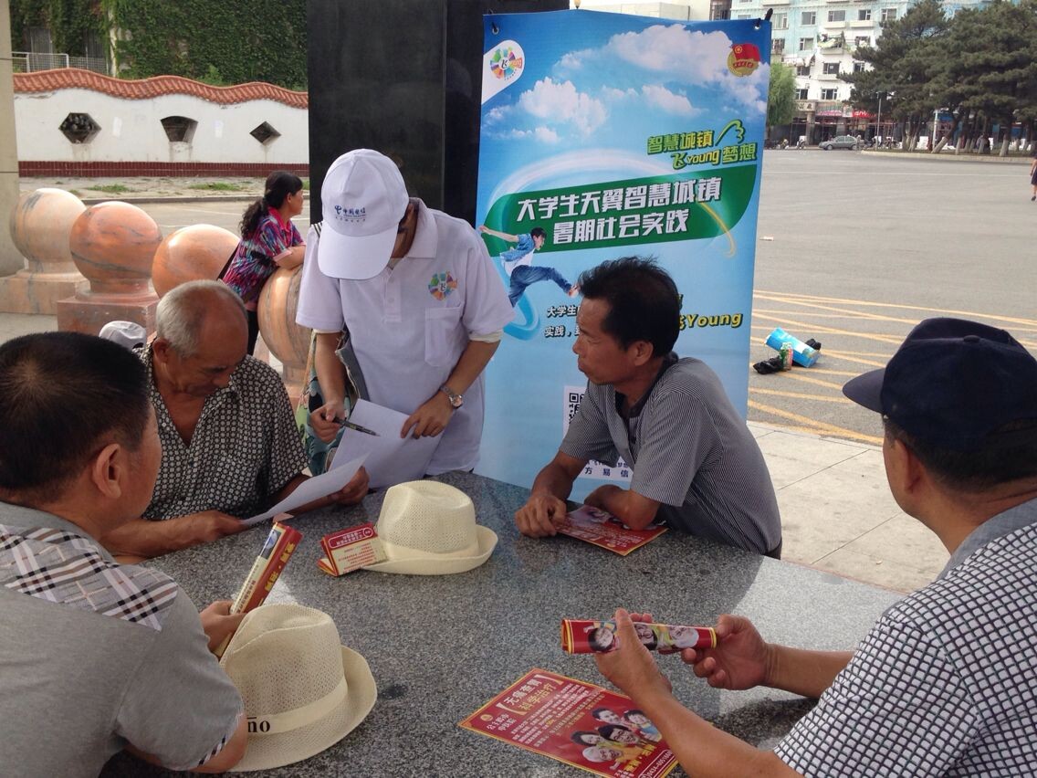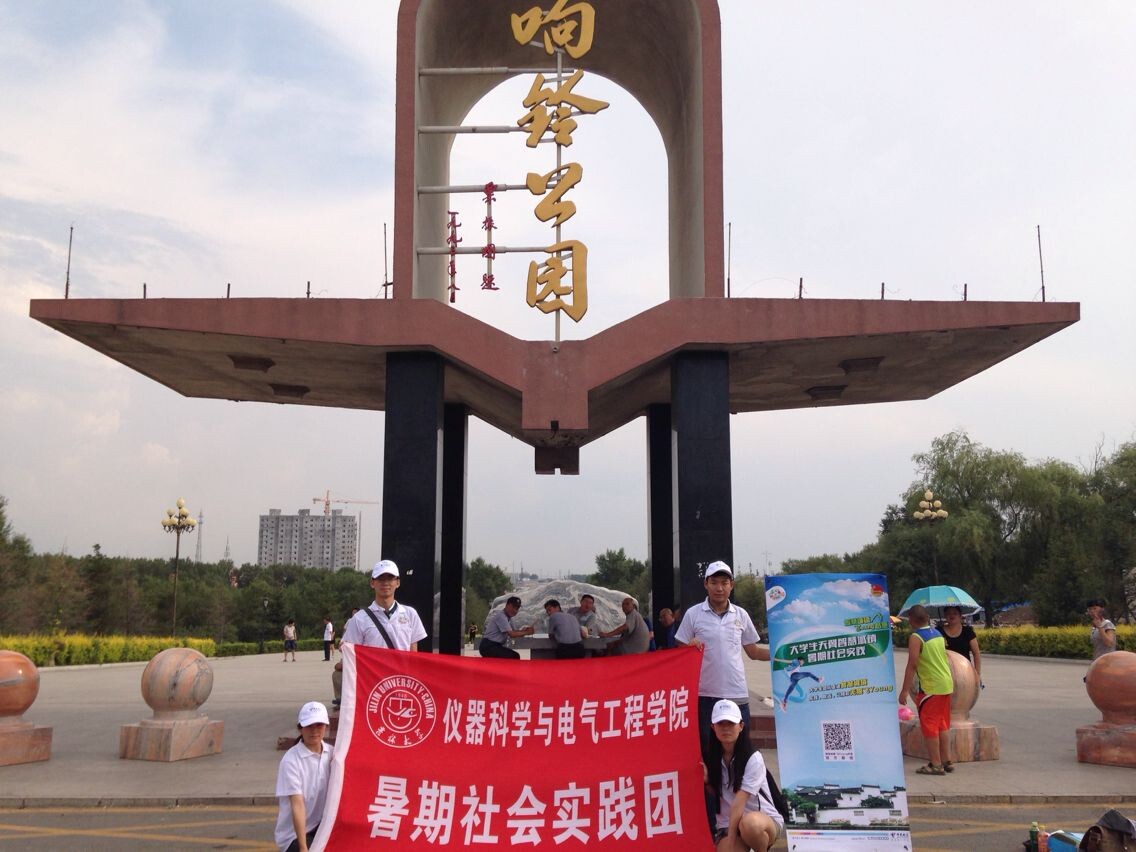 推荐为2014年暑期“三下乡”社会实践活动全国重点团队(“天翼”智慧城镇调研计划,全国共计100个团队)。8月17日,实践团主要成员走进公主岭市响铃公园开展了“智慧城镇,飞Young梦想”信息化专项调研活动。