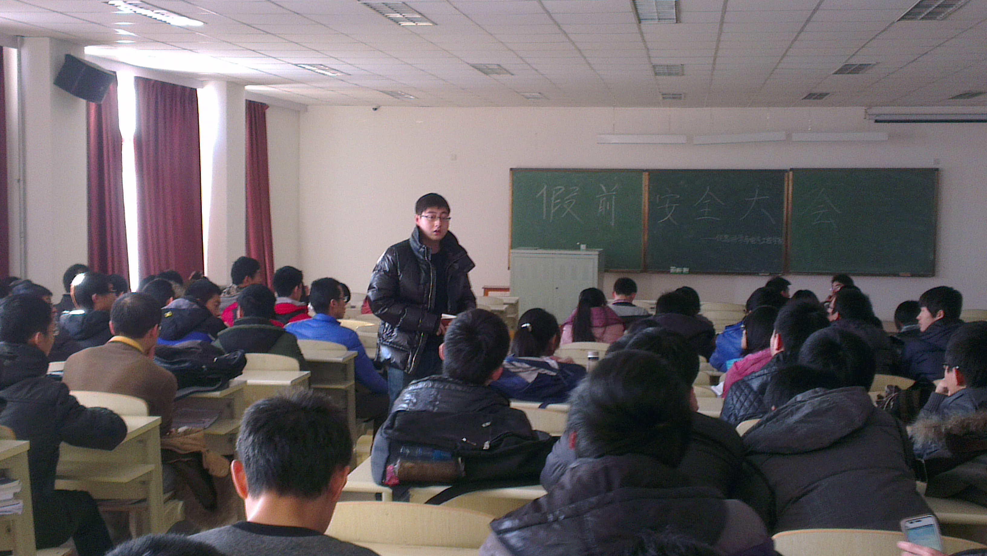 在大会中,蔡老师主要针对三个方面进行了讲解,第一:期末考试总动员;第二:宿舍安全方面;第三:寒假假期安全方面。
