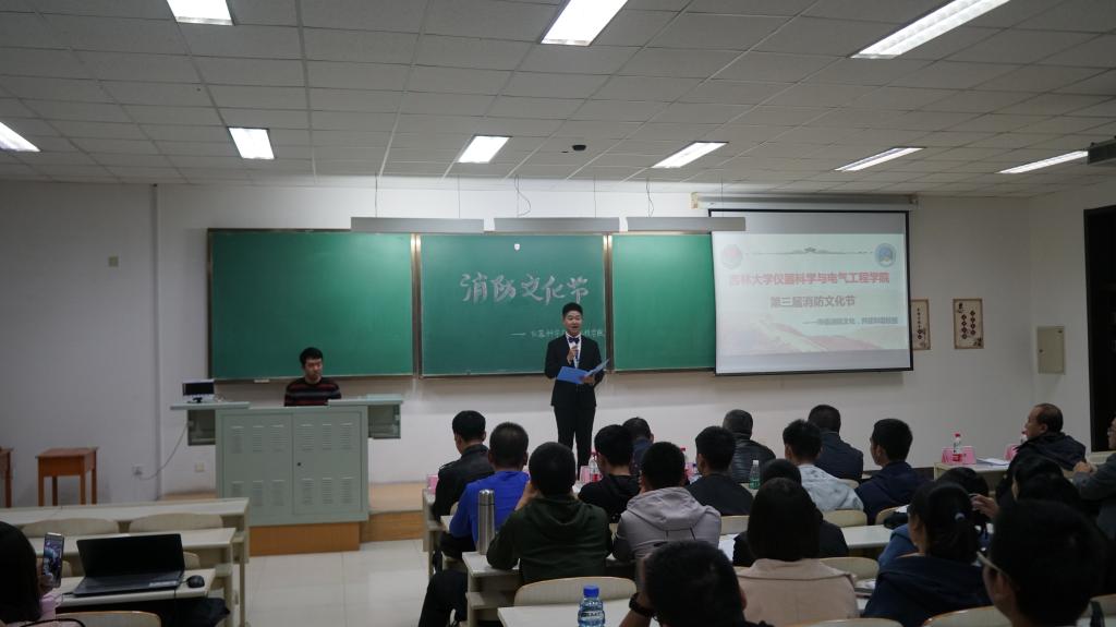 学子详细地介绍了日常生活中的消防安全隐患以及相应的处理方法,并且讲述了报警时候的注意事项,消防器材的使用方法等,同学们频频点头,收获满满,对消防安全有了更深的认识。第二环节,2018级各班选出的代表依次上台介绍了本班的消防文化节创意视频,展示的作品丰富多彩,贴近生活,既有趣又极具教育意义,赢得了全院师生的阵阵掌声。第三环节,2018级各班分别派出两名代表,通过抢答的方式回答不同的消防文化知识。同学们热情高涨,争先作答,各抒己见。第四环节,以班级为单位的抢答环节过后,同学们意犹未尽,主持人采取了互动的模式,随机抽取一道题,由台下的同学举手回答,同学们十分积极,踊跃抢答,尽展仪电学子风采。 第五环节,在紧张激烈的抢答之后,轻松愉悦的音乐响起,王爱民教授,齐占斌科长以及葛晓野老师为各个优秀的班级颁发证书。之后王爱民教授强调,消防安全重于泰山,我们每个人都要真正把消防安全牢记于心,将理论与实践相结合,做到防患于未然。同时,王爱民教授呼吁同学们关注消防安全,提高消防意识,为传播消防安全知识、构建平安校园共同努力。