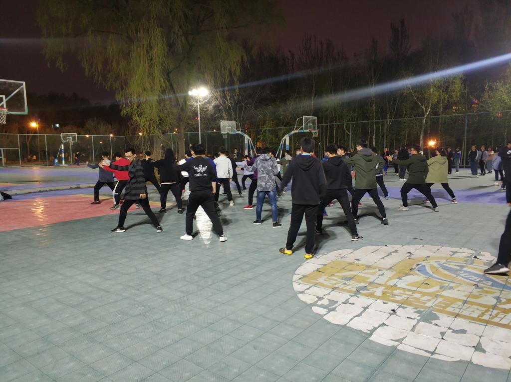 太极训练如期在行政楼篮球场展开,每一位太极方队的队员在教练宋雨鑫的指导与带领下连贯的学完了所有动作,并有条不紊地重复练习每一招一式以加深印象。在流畅、舒缓的音乐中,队员们的动作舒展,但节奏与队伍整齐度把握也待改善。每一位队员都全神贯注的训练,在教练的指导下调整自己每个动作,虽然现在的动作并不是十分完美,但大家的一招一式中都展现出了太极的柔和之美。