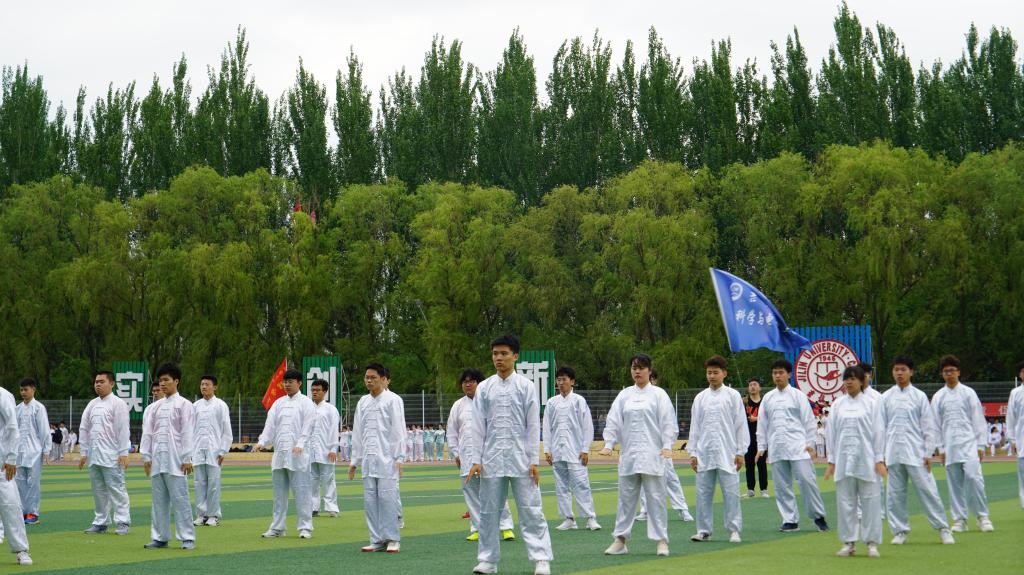 太极方队由32名队员和一名旗手组成,随着入场口令的下达,方队踏着整齐的步伐,喊着响亮的口号进入场地中央。在舒缓的音乐中,同学们动作舒展大气,节奏稳健,队伍整齐划一,充分展现了太极的柔和之美。