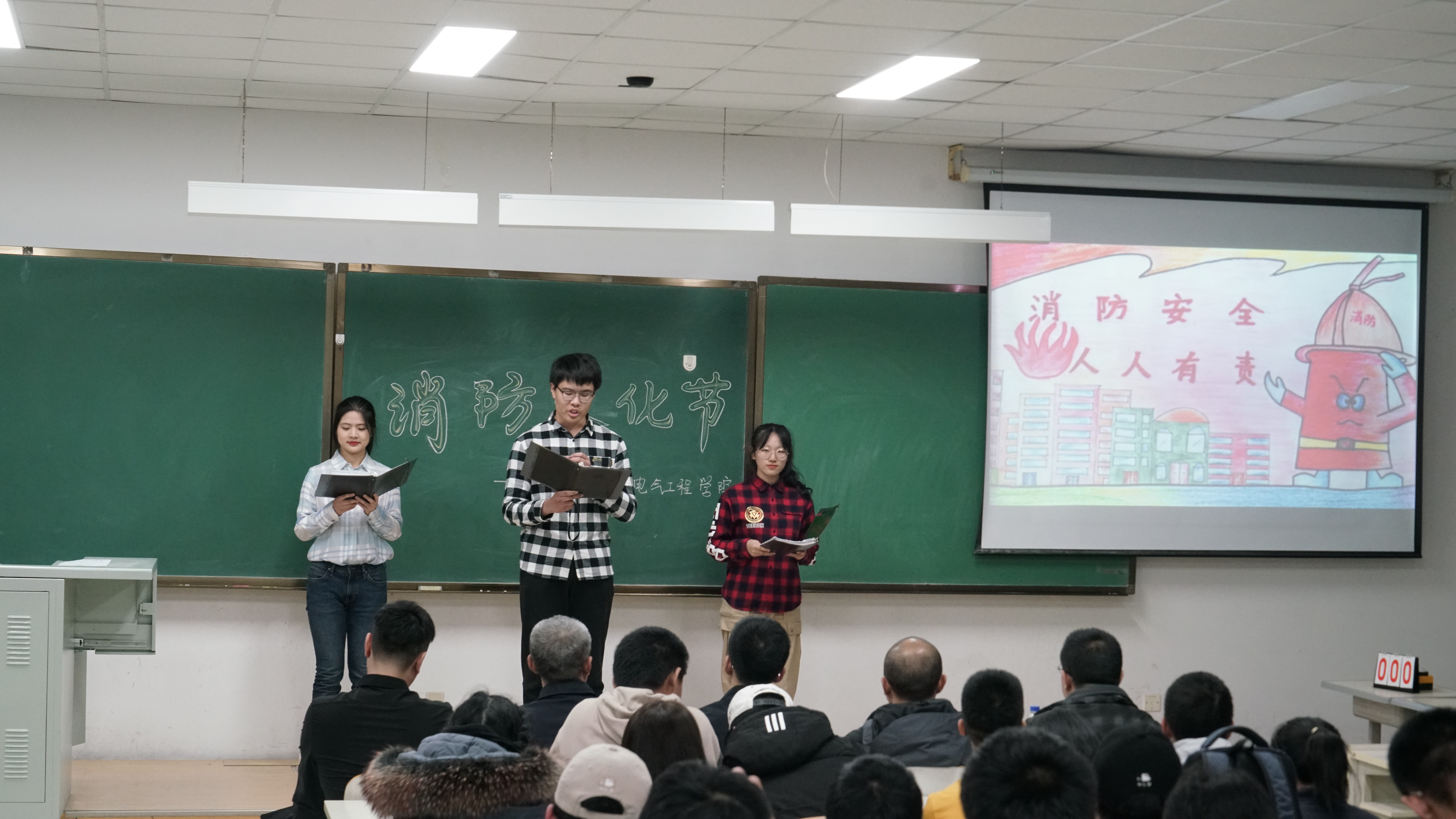 学子度过安全且充实的大学时光。艾老师演讲结束后,2020级的同学们依次上台展示消防安全宣传教育作品,展示的作品丰富多彩,贴近生活,既有趣又极具教育意义,赢得了全院师生的阵阵掌声。作品展示过后,进入消防安全知识竞答环节,各班代表们踊跃参与,争先作答。随后,主持人与现场观众互动,同学们举手抢答,气氛活跃。在经过激烈的抢答后,主持人公布了本次消防文化节作品的评选结果,并由边江老师、艾维斯老师、周伟老师依次为获奖班级颁发证书。活动最后,周伟老师为本次活动总结讲话,他高度肯定了活动开展的意义,并就大学生群体与防范火灾之间的关系做出阐述;最后,周老师呼吁同学们在日常生活中关注消防安全,提高消防意识。至此,本次消防文化节活动圆满落下帷幕。