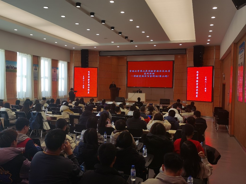 副院长张贺主讲,张贺结合多起由危险化学品引发事故的典型案例,深入分析了实验室用电、用火、危险化学试剂管理等方面可能存在的潜在危险,为参会师生树立了预防为主、未雨绸缪的指导思想。讲座第二部分由广州德标智能化工程有限公司的戴红军主讲,戴红军以《实验室气体安全讲座》为题,重点介绍了有毒气体、易燃易爆气体、惰性气体等可能造成的危害,并对高校实验室气体钢瓶的常见隐患进行了分析。讲座第三部分由长春奥狮环境监测有限公司的刘宇臣主讲,讲座内容包括电离辐射的类型、电离辐射的危害、电离辐射的防护等方面知识。