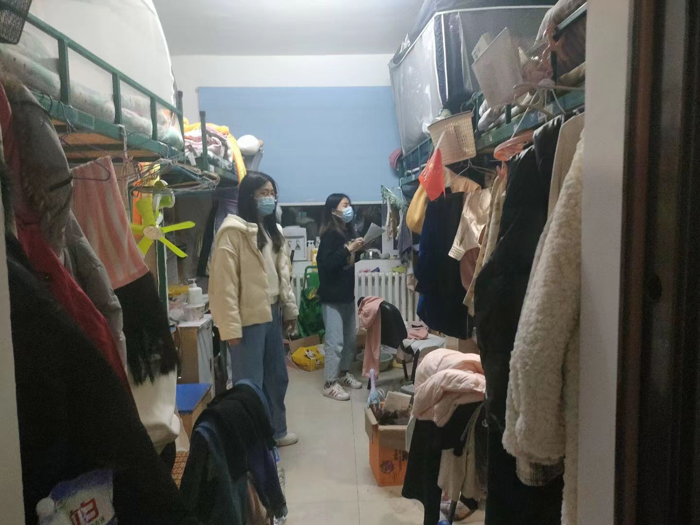 2019级、2020级辅导员马姗姗、研究生兼职辅导员史博日深入高年级学生寝室进行卫生安全检查,了解学生近期的思想动态和学习生活情况。