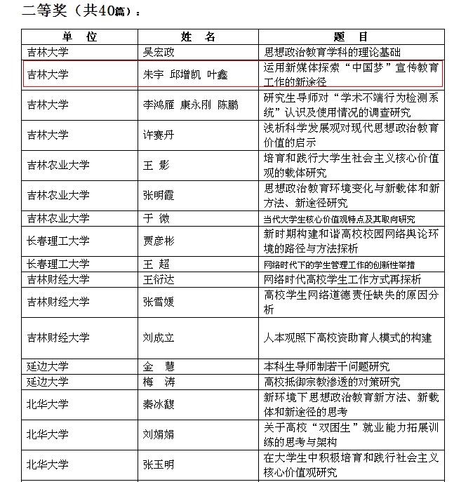 报送的2篇论文全部获奖,其中朱宇、邱增凯、叶鑫的论文《运用新媒体探索“中国梦”宣传教育工作的新途径》荣获全省二等奖,蔡印、邱增凯的论文《“十八大”精神与高校思想政治教育之我见》获三等奖。