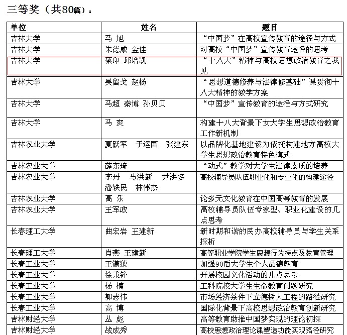 思想政治教育质量,吉林省教育厅、吉林省高校德育研究会联合举办了全省“高校思想政治教育创新”优秀论文评选活动。