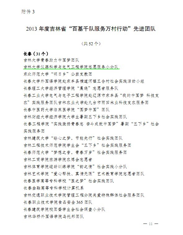 在中共吉林省委宣传部、吉林省文明办、吉林省教育厅、共青团吉林省委、吉林省学生联合会联合下发的《关于表彰2013年吉林省大中专学生志愿者暑期“三下乡”社会实践活动暨“百基千队服务万村行动”先进集体和个人的决定》中,黑料不打烊