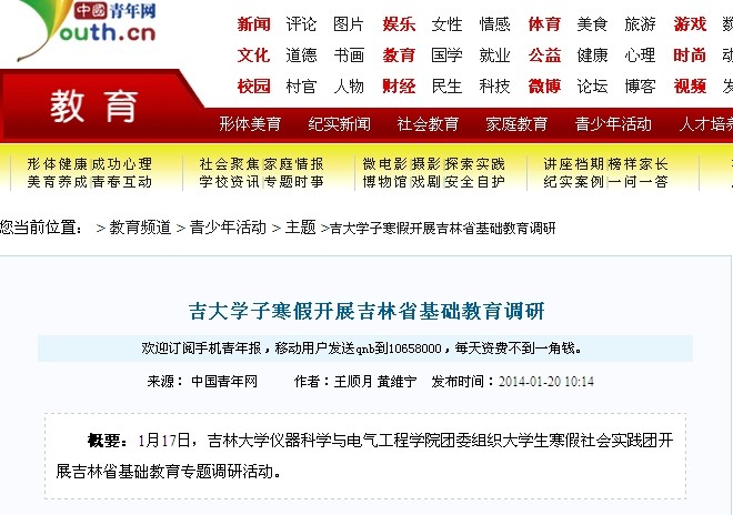 大学生寒假社会实践团在院团委书记朱宇带领下开展的吉林省基础教育调研活动受到了共青团中央主办的中央重点新闻网站——中国青年网的关注报道,中国青年网于1月20日以《黑料不打烊