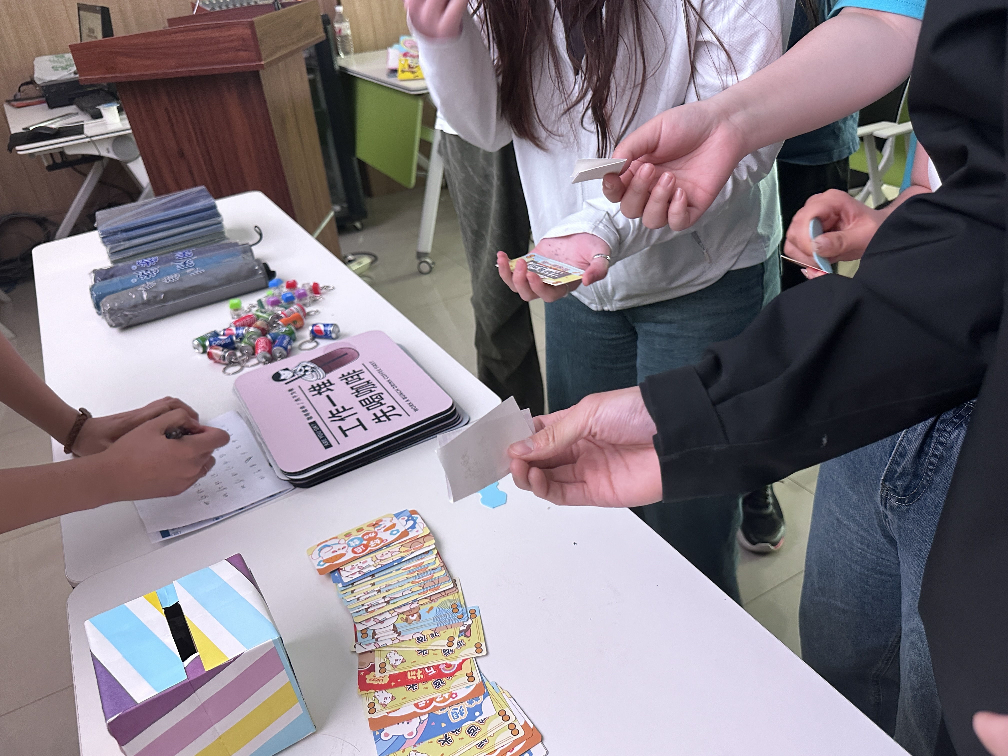 本次活动以轻松愉快、充满创意的方式展开,独具匠心地采用了“情绪卡片”兑换“彩票”的形式,极大地降低了参与门槛,让每位研究生都能轻松融入其中,同时也大大增强了活动的趣味性和吸引力。同学们纷纷在活动准备的情绪卡片上倾吐心声,将自己的焦虑、困扰或烦恼真诚地记录下来,然后将卡片轻轻放入“情绪兑换机”中。随后,他们便有机会从充满惊喜的“彩票”盲盒中随机抽取一张刮刮乐卡片,并凭此兑换精美解压小礼物。