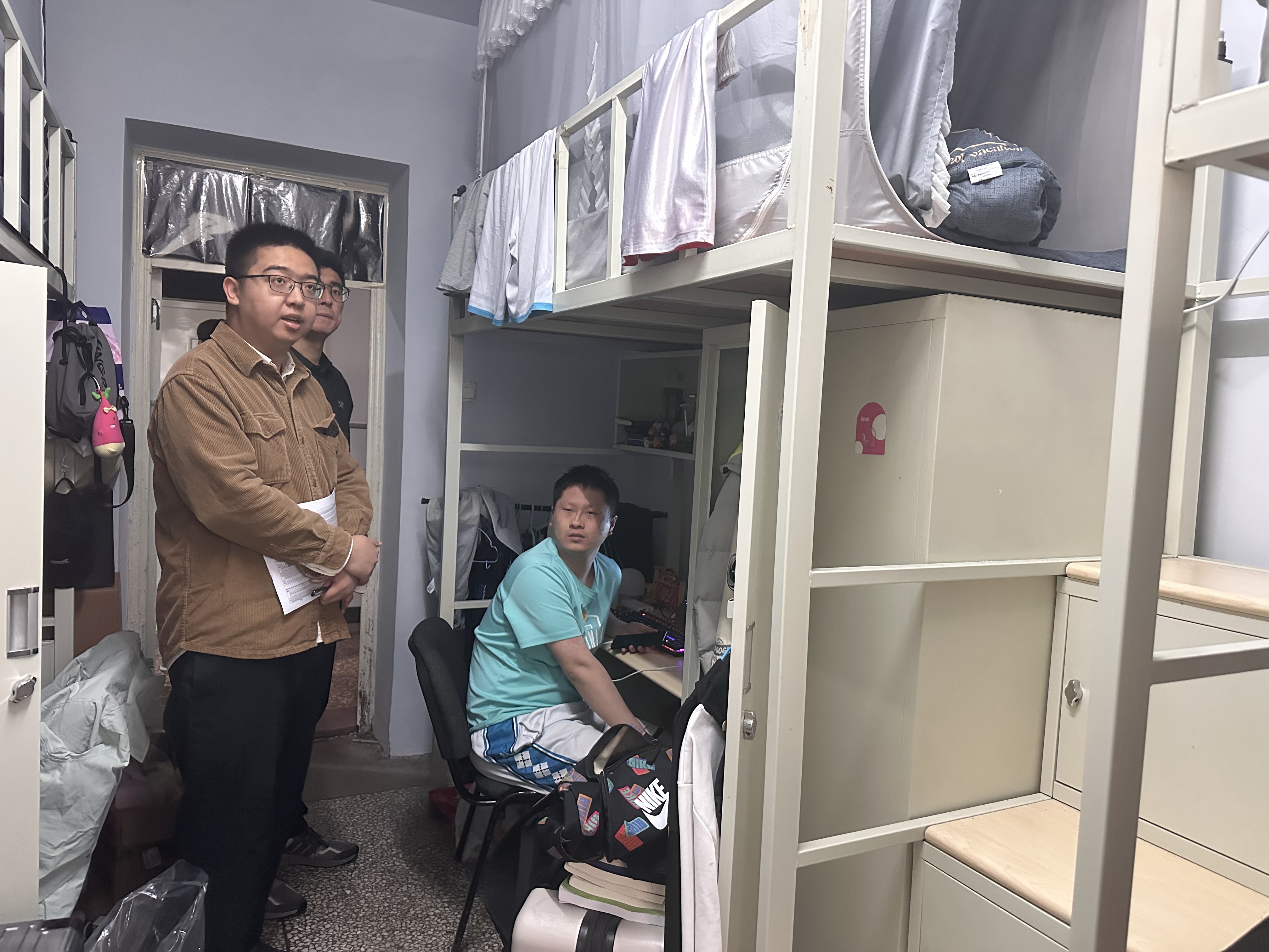 在朝阳校区地质宫各实验室,各位辅导员与研究生导师、本科生毕业设计导师深入交流,强调实验室用电安全,了解研究生及本科毕业生的科研及毕业设计进展情况,现场为学业困难学生制定帮扶方案;在学生寝室,各位辅导员针对寝室卫生状况、电源插座使用规范、电器设备合规性等进行认真细致排查,并建议同学们勤通风、常打扫,共同维护整洁有序的居住环境;提醒大家合理规划学习时间,注重劳逸结合,以良好状态迎接期末考试。