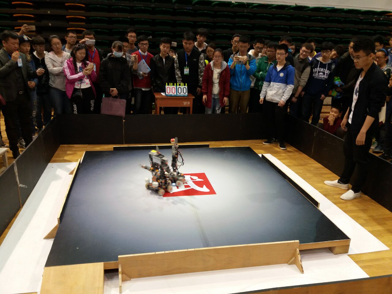 科协成员组成,全场维持秩序。创意组机器人的太极表演、机械臂灵活抓取表演、“小六”表演等等,都得到了老师们极大的肯定,刚柔并进,轻巧灵活,开合有序。而六足机器人比赛可谓是比赛最惊险刺激的环节,每一步都惊险万分,比拼的不仅是机器人在赛场上的发挥,更是同学们平时的努力。同学们平时日夜苦熬的价值在此刻得到了体现,而六足机器人也不负众望,取得了令人满意的成绩。武林之争,人形机器人比赛,小车对抗赛,飞机切气球比赛,动作投影等等这些都是精彩至极,难得一见。而这些成果都离不开老师的细心教导,离不开同学们的艰苦奋斗,是大家许许多多日日夜夜熬出来的成果,可谓是“台上一分钟,台下十年功”。