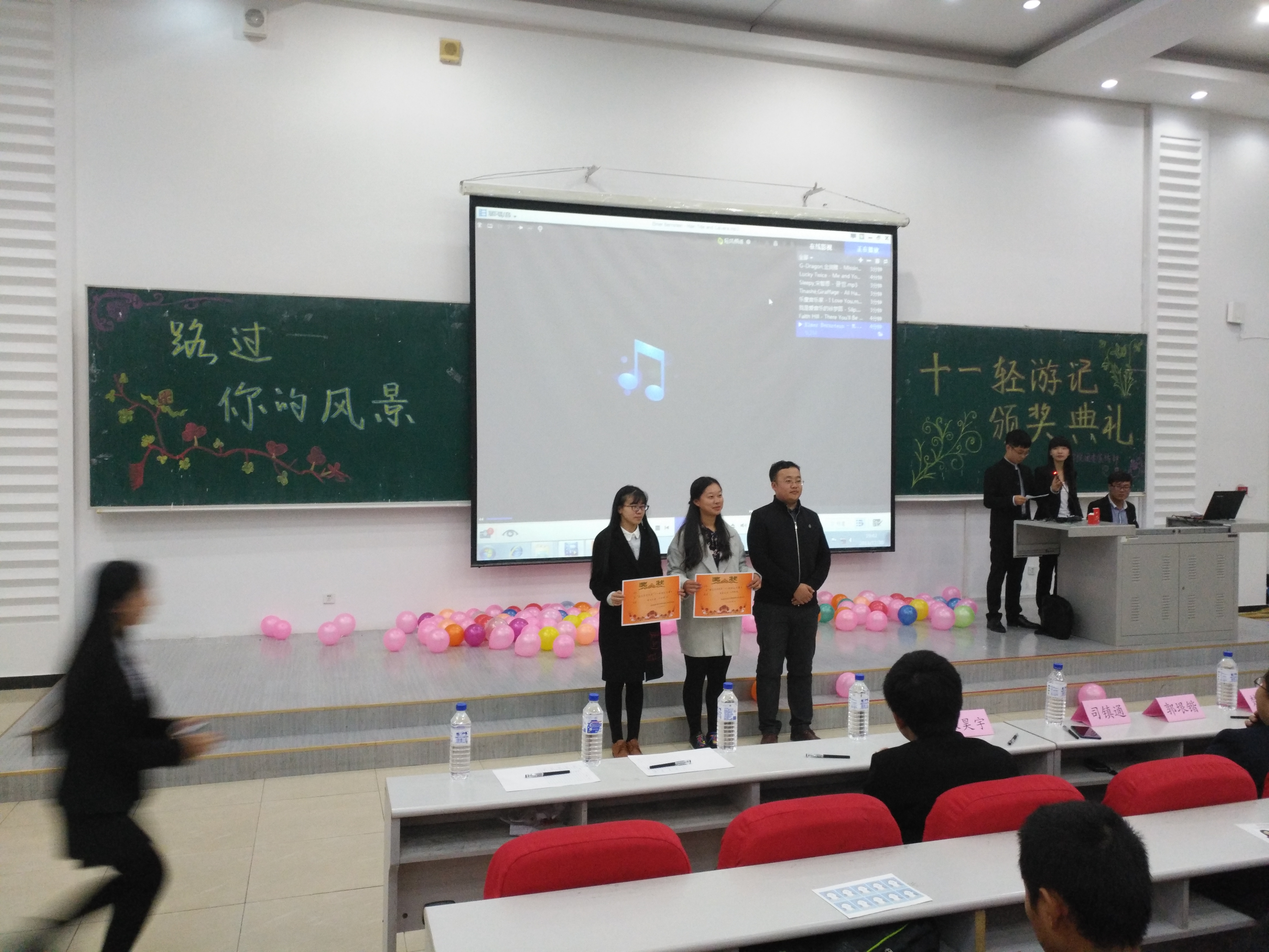 老师到达现场参与评选。活动期间,十五位参赛选手对各自的作品进行了生动形象的描述,描绘了各式各样的或优美或壮丽的富有特色的风景,讲述了拍摄的时间、情景以及自己在十一旅游期间的感受,让在场听众仿佛身临其境,沉浸在照片中风景的世界里。随后,主持人对活动的赞助方日新楼美奈映像证件照专门店进行了简单的介绍。
