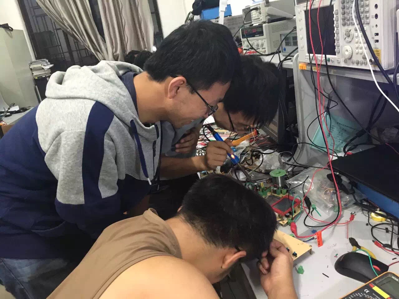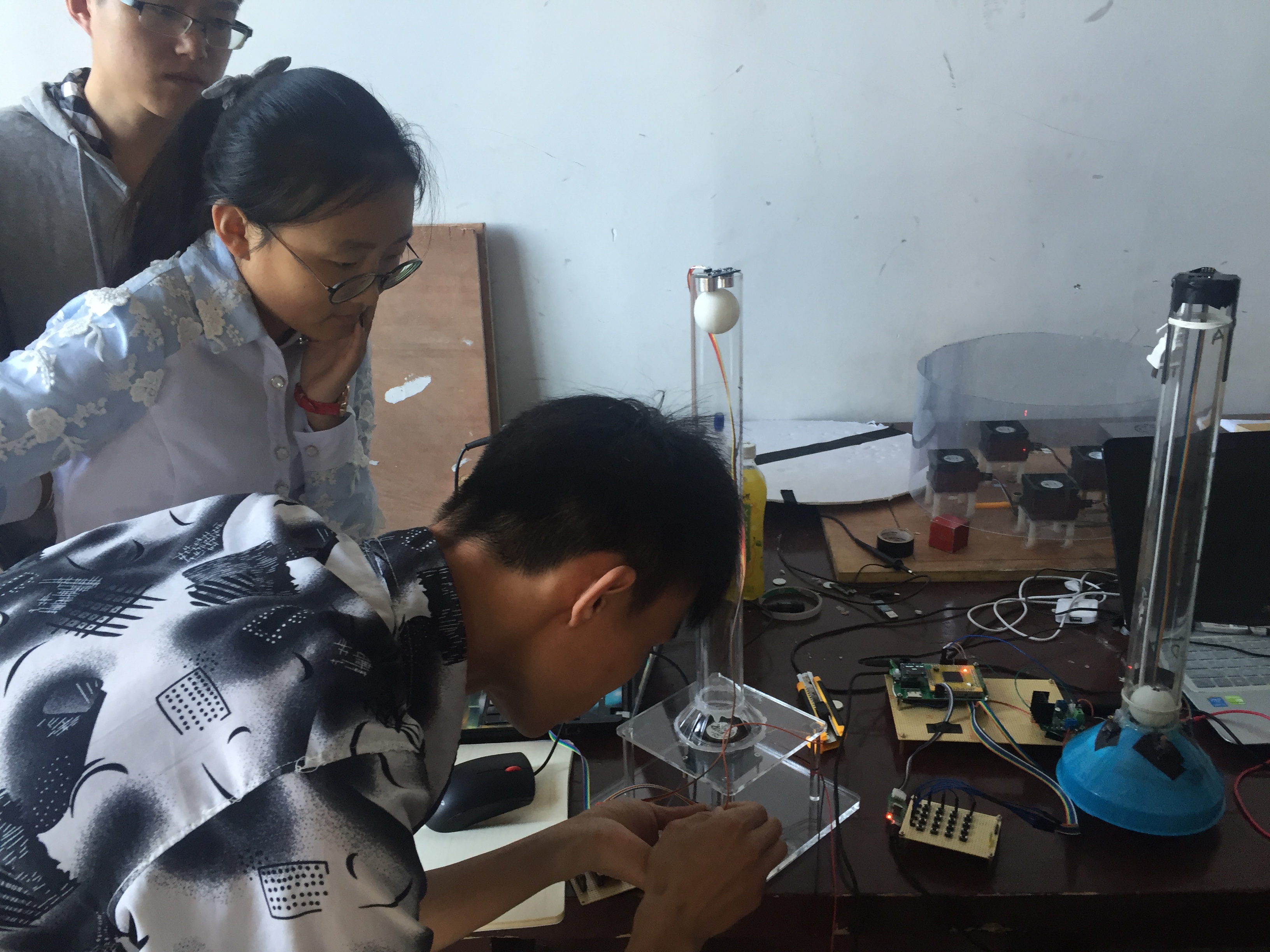 刻苦拼搏的精神,秉承实验室多年来精益求精的理想,始终奋斗在实验室。当中,大一新生杨洋的努力格外引人注目。作为卓越工程师班的学生,不仅追求学业成绩优秀,而且励志在实践方面也同样做到巾帼不让须眉。由于平时缺乏实践方面的培训,面对困难的她并没有气馁,反而增加了自己在实验室的时间,她用比别人多花的时间将实践方面的缺陷慢慢地补了回来。“人十能之,己百之”,正是凭借着这种精神,杨洋同学交出了一份令人满意的答卷。14级控制组为了能顺利的控制好乒乓球的悬浮,不仅自学3D打印机的使用,而且学会了利用刻板机刻制电路板,他们在目标的驱动下、老师和学长的帮助下不断地进步、不断地充实自己。此外,作为主力的13级学生也有条不紊地进行工作,不少学生为了能挤出更多的时间不惜在实验室打地铺睡觉。期间,为了检测大家在培训期间的成果,千承辉老师举行并主持了中期检查,所有学生的作品都受到了严格的审查和仔细的点评,检查过程中同学们相互交流,氛围良好。