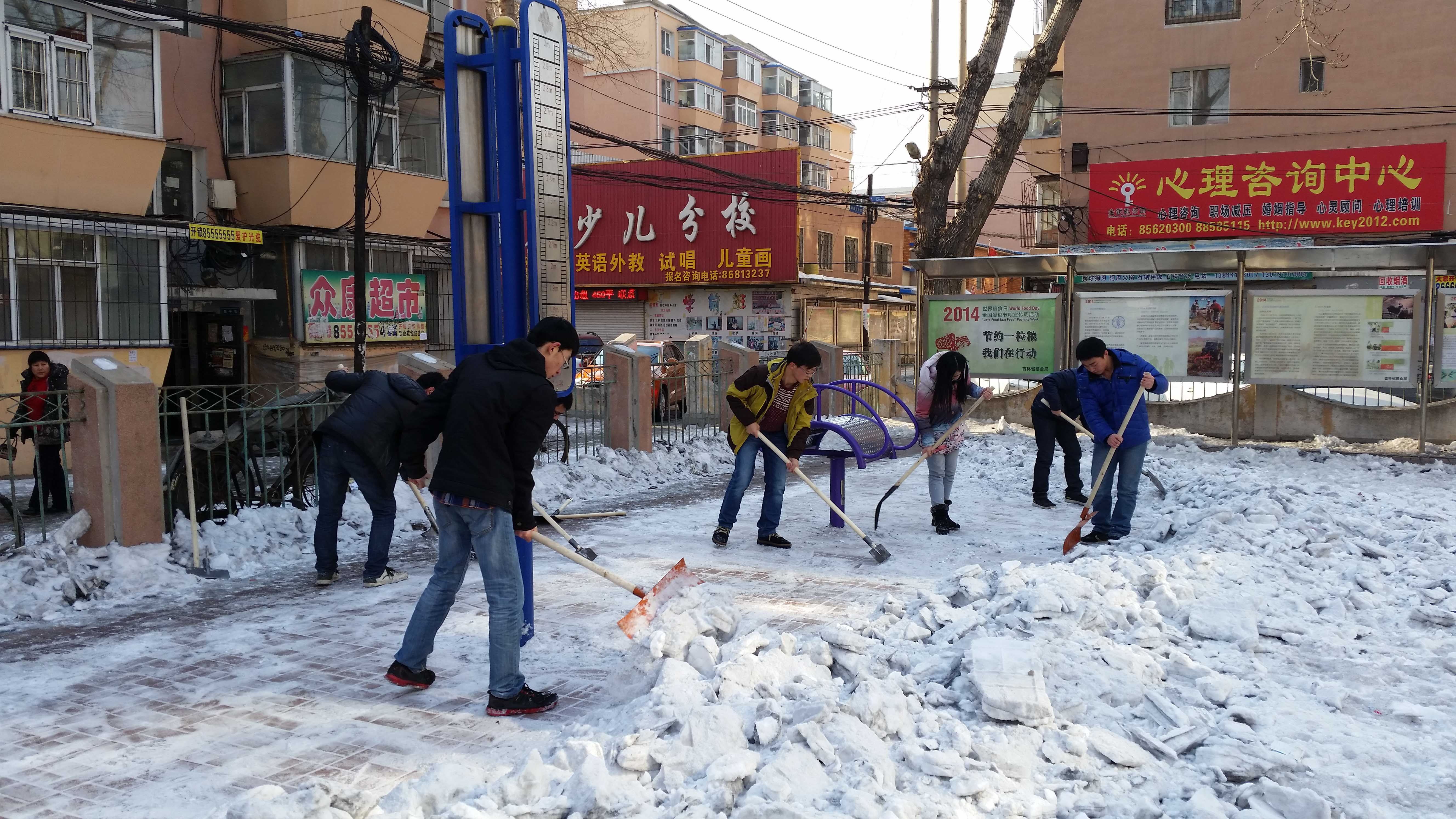 团委迅速组织志愿者进入社区进行除冰除雪活动。社区工作人员对大学生志愿者们的到来表示热烈欢迎,并代表社区全体居民对大家表示感谢。随后,大学生志愿者们迅速投入到了“紧张而忙碌”的除雪除冰大战中。全体志愿者们分工明确、团结协作,发扬雷锋精神,不怕苦、不怕累,主要对社区广场进行了清扫,但是由于积雪长时间未除积攒较厚,加上天气变暖造成的部分积雪融化又结冰,使得此次积雪清理并不是非常顺利,志愿者们只能先用铁锹一点一点的把冰块敲碎,然后才能整个清除掉。大家认真细致地完成每个环节。虽然天气寒冷,许多同学的脸和手都冻红冻僵了,但是大家热情似火、干劲十足,社区很快就被大家清扫干净,面貌焕然一新,志愿者们的脸上也露出了开心和满足的笑容。大扫除活动结束后,社区工作人员和居民们纷纷对大学生志愿者们的辛勤劳动给予了高度评价。