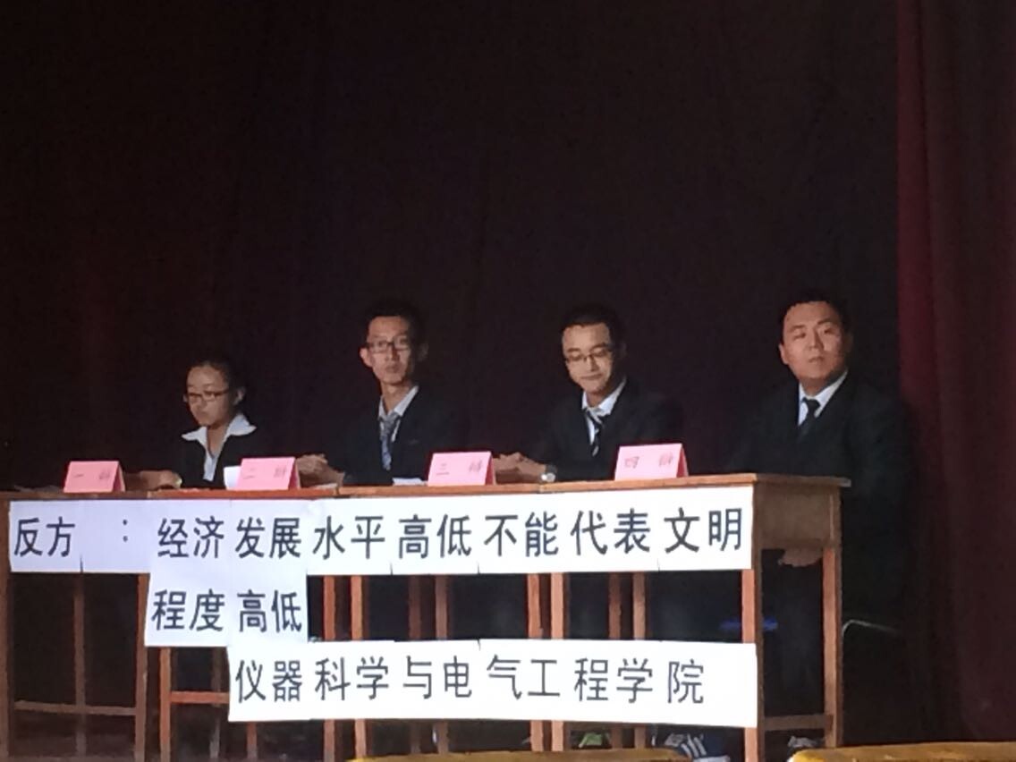 通过层层选拔挑选出四位辩手参加首场比赛,一辩庞毅狄口齿伶俐,简明扼要,立论阶段就充分阐述并论证了本方观点;二辩孙德立大气老成,稳如泰山,气场强大,攻辩阶段接连抛给对方辩友数个犀利的问题,巩固了本方优势;三辩秦琪对阵对方强大的三辩,临危不乱,依然思路清晰,进一步阐明了本方观点;四辩汤润泽,总结陈词阶段系统分析了对方整场辩论赛的漏洞,一一披荆斩棘,从对方漏洞出发,理性分析,实例论证,充分论证了对方观点的片面性和错误性,更深一步论证了本方观点的正确。然而,地球科学黑料不打烊