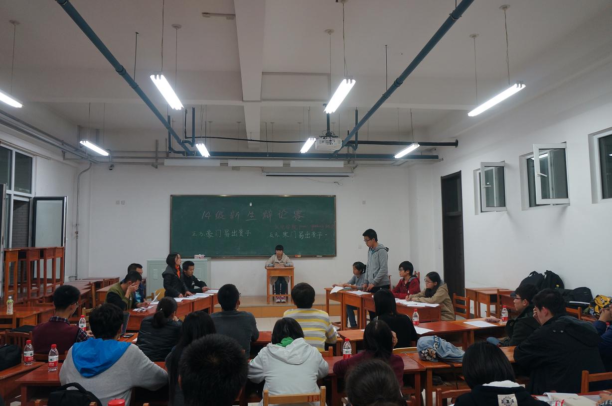 学生会举办的“先锋论坛训练赛”于2014年11月3日晚在李四光楼318教室举行。本场比赛由“Power Speaking”协会成员及历届辩论赛的精英辩手担任评委及主持人,辩题分别为“豪门易出贵子VS寒门易出贵子”和“no zuo no die VS no zuo no live”。