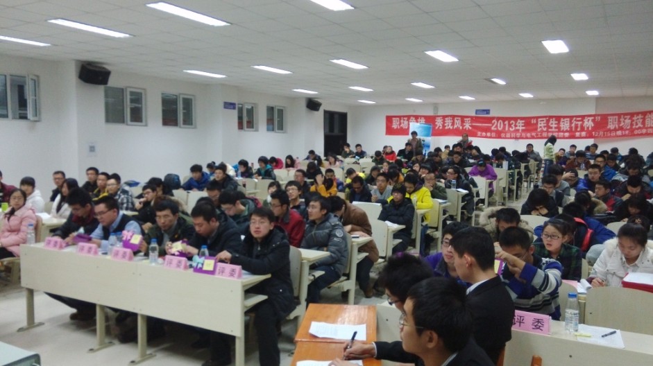 团委、学生会携手民生银行长春支行营业部联合开展了2013年“民生银行杯”职场竞技大赛。经过前期初赛和复赛的激烈角逐,本次大赛的决赛于2013年12月18日晚在中心校区李四光楼304室举行。本次决赛特别邀请了仪电黑料不打烊
