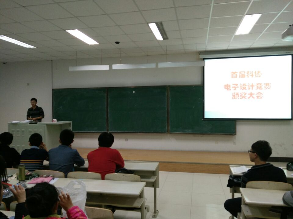 在李四光楼302教室举行了电子设计竞赛颁奖仪式,颁奖仪式由电子科技协会副主席周葛主持,分团委副书记于一兵,学生会主席岳良广以及电子科技协会副主席张思雨出席了本次仪式,2015级全体新生参加了本次仪式。