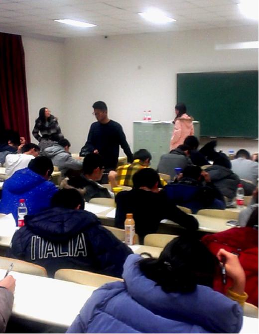 分团委学生会学习部组织2012级新生在中心校区李四光楼进行期末模拟考试。2012级辅导员蔡印老师、学生会各部部长来到考场进行监考工作。