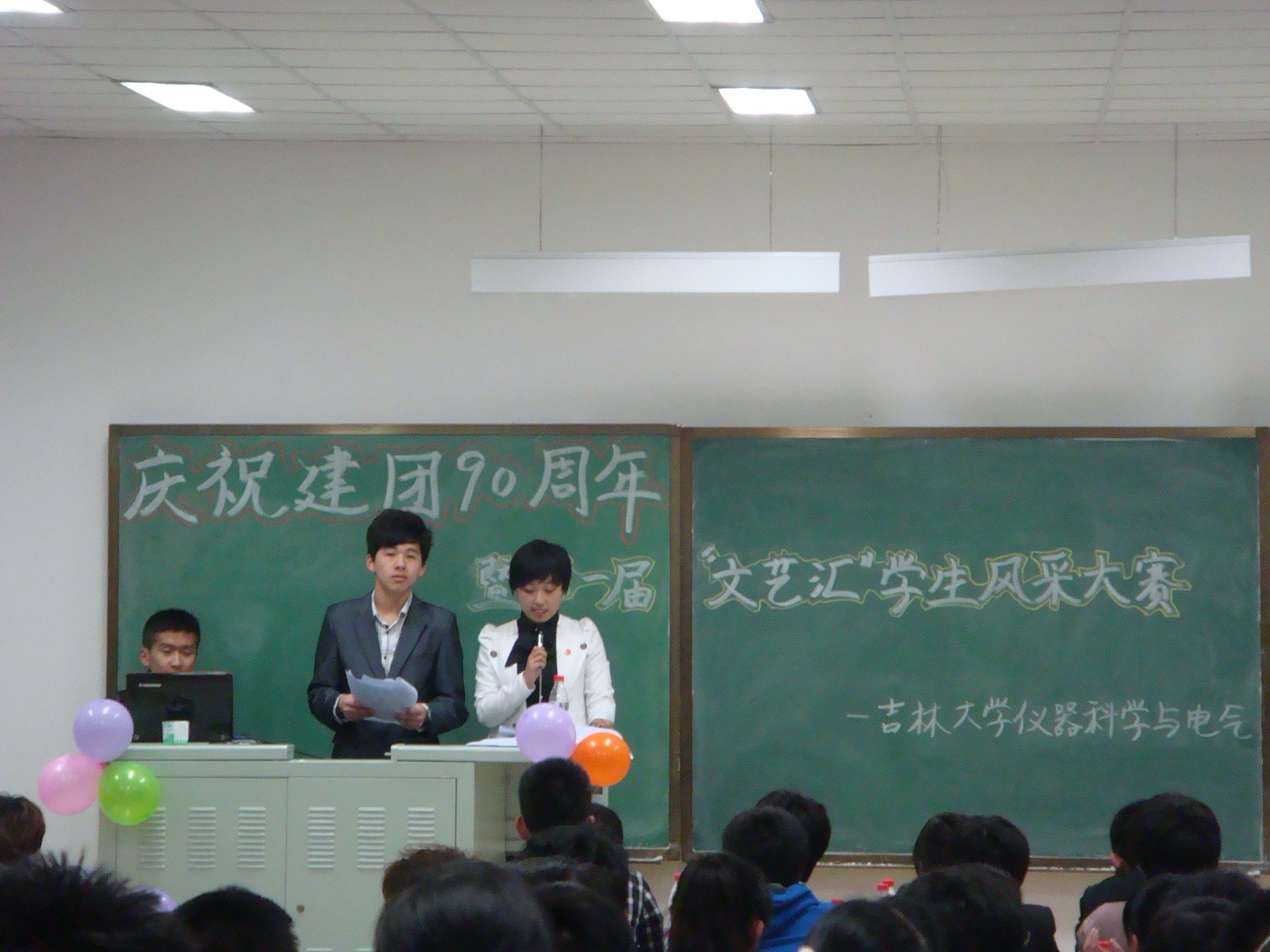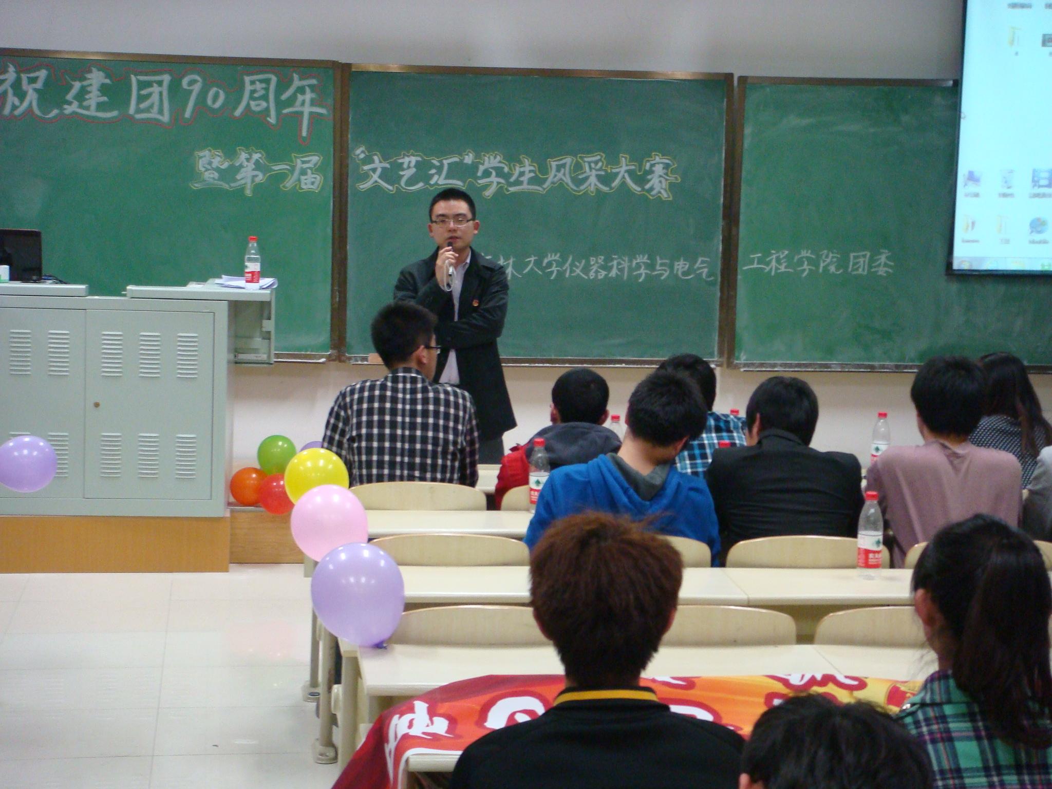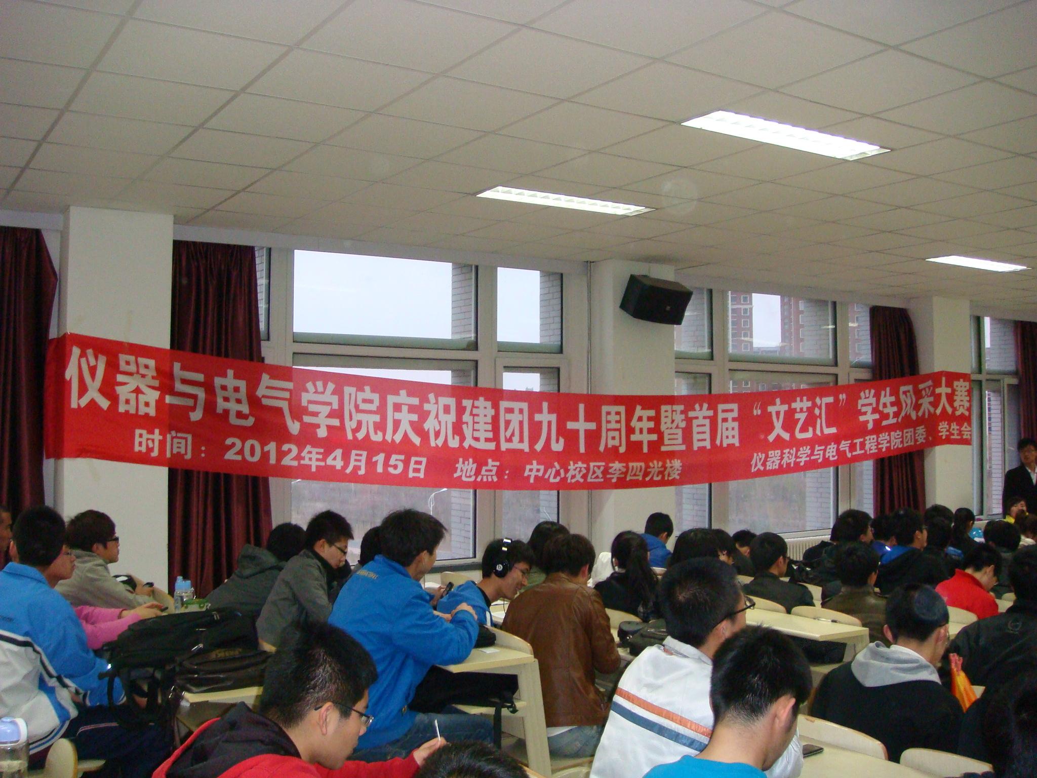 团委、学生会于2012年4月15日18:00在中心校区李四光楼302教室举办了以庆祝建团90周年——“感怀历史,舞动风采”为主题的第一届“文艺汇”学生风采大赛,院学生工作办公室主任兼2010级辅导员王冕、院团委副书记兼2011级辅导员朱宇、第七届院学生会主席许鹏、第七届分团委副书记包志强及第七届院学生会全体成员、2011级全体同学参加了此次活动,活动由2011级关钊、张楠主持。
