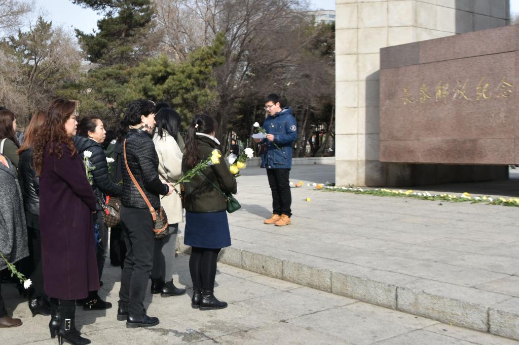 上午7:00,寒风中志愿者们到达南湖公园解放纪念碑处,等待街道工作人员与各居民志愿者到达。上午8:30,各项准备工作就绪,祭祀活动正式开始。街道办工作人员介绍了长春的解放历史和英烈们英勇斗争的事迹,同志愿者们一起面向纪念碑默哀一分钟。居民志愿者发言后,马松辰同学代表全体学生党员和积极分子发表致敬词,表示同学们真切感受到了革命先烈的伟大和崇高,一定会将先烈们的精神传承下去,发扬光大。活动结束前,志愿者们依次向纪念碑献花,表达对革命先烈们的追思与崇敬。