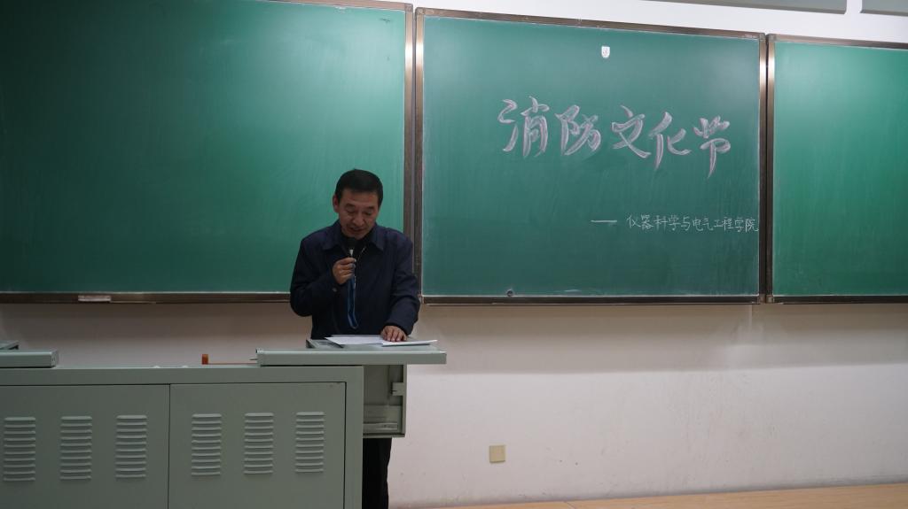 学子详细地介绍了日常生活中的消防安全隐患以及相应的处理方法,并且讲述了报警时候的注意事项,消防器材的使用方法等,同学们频频点头,收获满满,对消防安全有了更深的认识。第二环节,2018级各班选出的代表依次上台介绍了本班的消防文化节创意视频,展示的作品丰富多彩,贴近生活,既有趣又极具教育意义,赢得了全院师生的阵阵掌声。第三环节,2018级各班分别派出两名代表,通过抢答的方式回答不同的消防文化知识。同学们热情高涨,争先作答,各抒己见。第四环节,以班级为单位的抢答环节过后,同学们意犹未尽,主持人采取了互动的模式,随机抽取一道题,由台下的同学举手回答,同学们十分积极,踊跃抢答,尽展仪电学子风采。 第五环节,在紧张激烈的抢答之后,轻松愉悦的音乐响起,王爱民教授,齐占斌科长以及葛晓野老师为各个优秀的班级颁发证书。之后王爱民教授强调,消防安全重于泰山,我们每个人都要真正把消防安全牢记于心,将理论与实践相结合,做到防患于未然。同时,王爱民教授呼吁同学们关注消防安全,提高消防意识,为传播消防安全知识、构建平安校园共同努力。