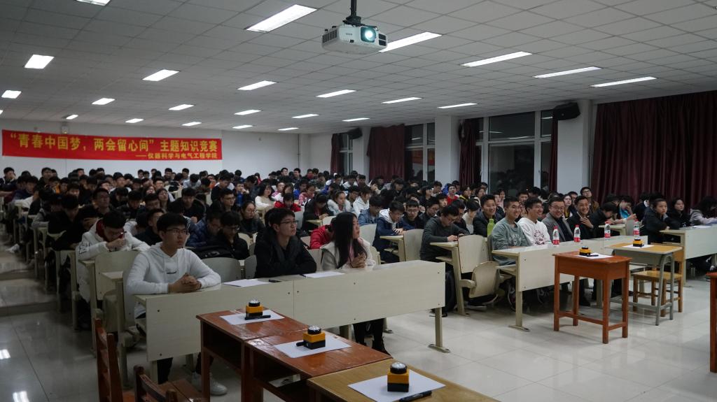 本次活动共分为四个部分。第一环节为必答题,参赛班级的选手代表在答题纸上依次写下10道必答题的答案,然后由工作人员计分,在本环节中七个班的得分情况不分上下,由此可见同学们对“两会”知识掌握之深。第一环节紧张而又刺激,为缓解气氛,接下来是观众互动环节,由嘉宾向观众提问并随机选择观众回答,旨在让观众也参与到活动中来,本环节共设有4个问题,提问期间同学们都纷纷举手抢答,现场情况热闹之极。经过了第二环节现场氛围高涨,随之而来的是考验选手反应速度和知识储备量的抢答环节,虽然该环节的试题较第一环节难,但参赛选手们依旧信心满满,在比赛过程中为班级荣誉一站到底。